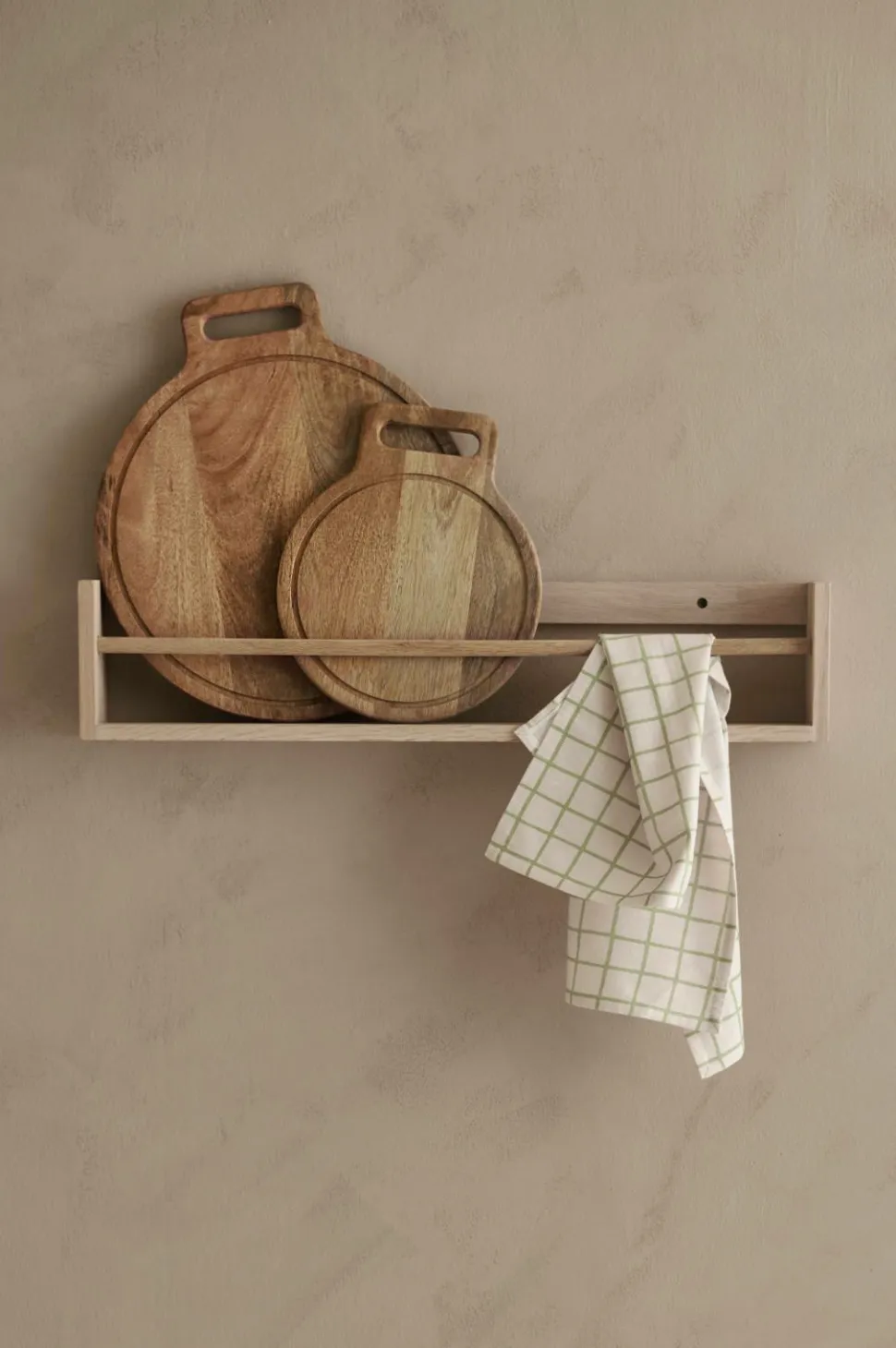 En mindre hylde/knagerække som er vendbar og kan hænges på to måder. Det gør at den har mange anvendelsesområder, f.eks. som håndklædeholder, krydderihylde, knagerække eller en minihylde til småting. Fremstillet af massiv, sæbebehandlet eg.