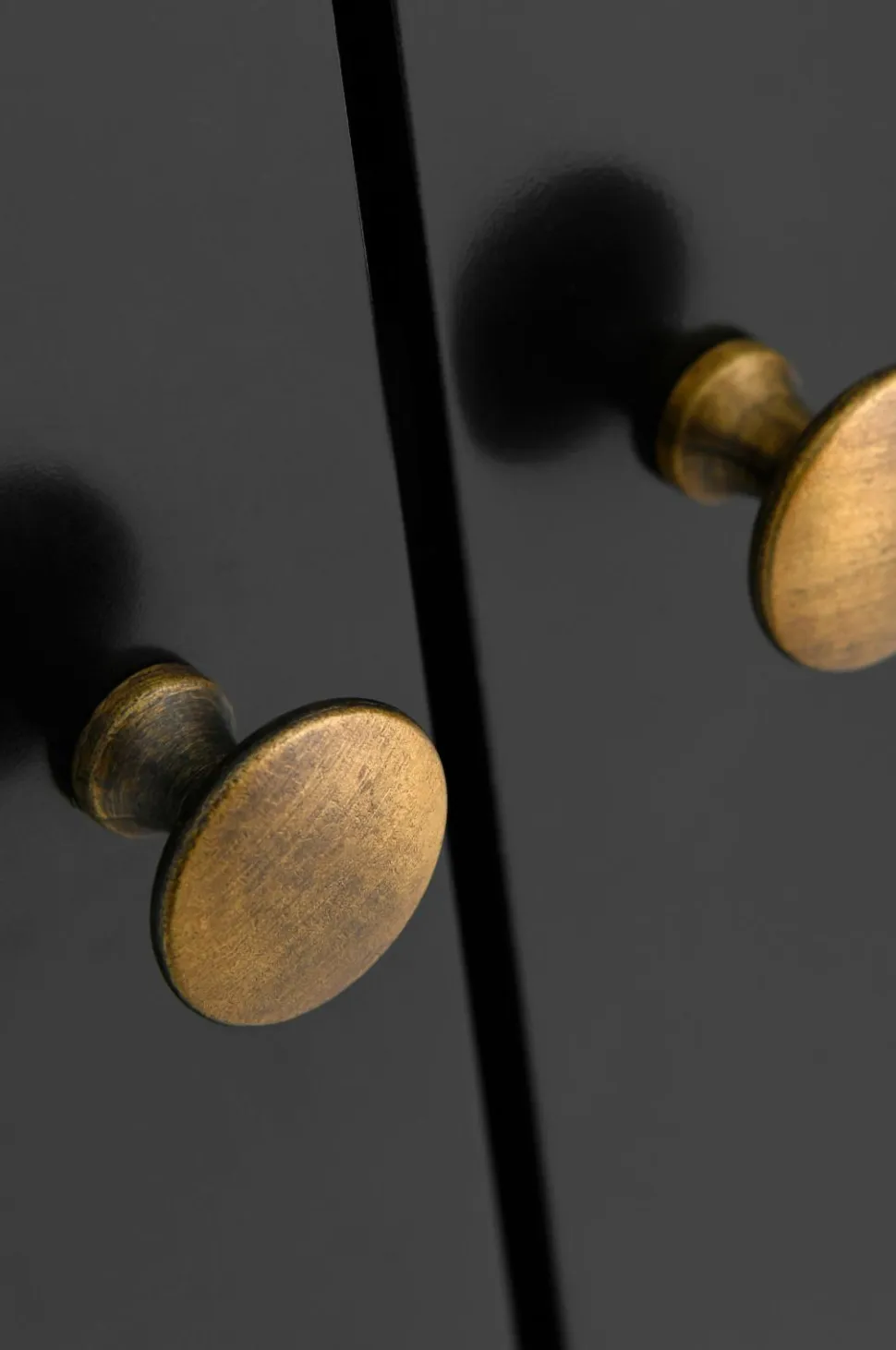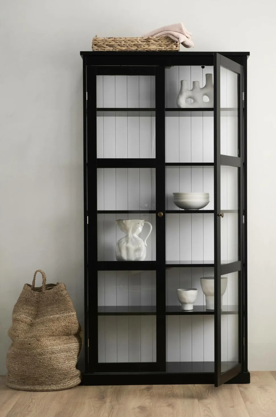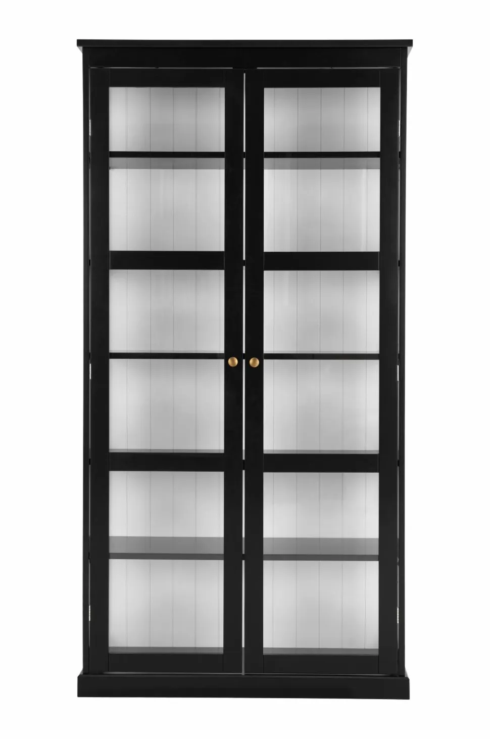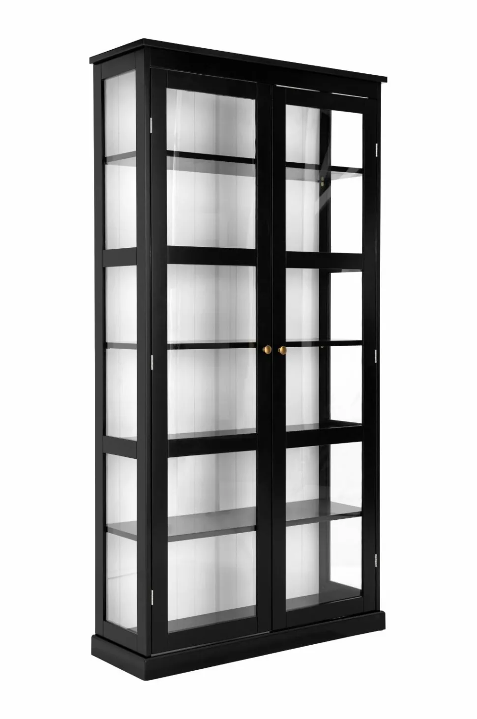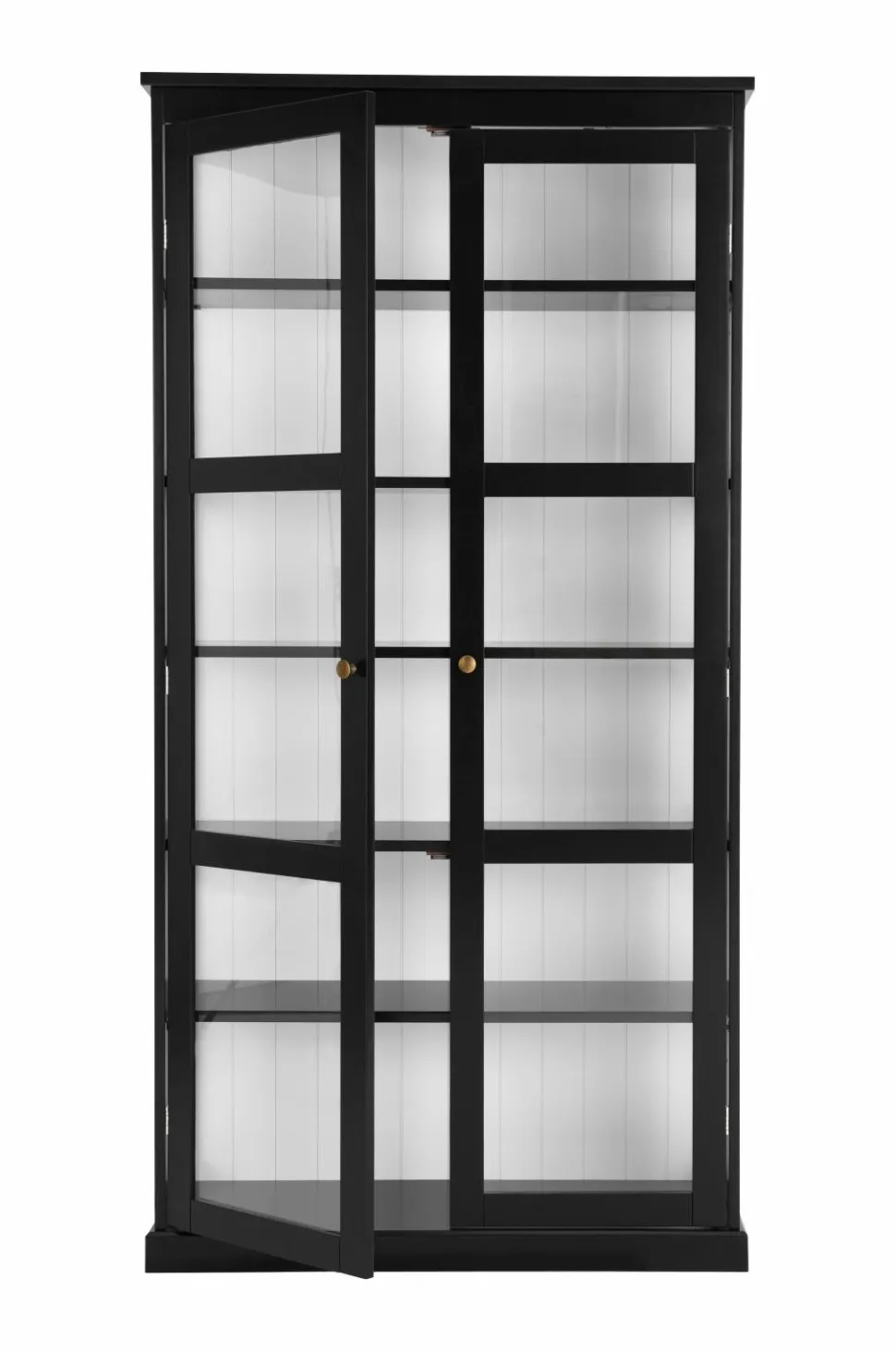 Vitrineskab i MDF og transparent glas. Glas langs hele siden som slipper lys ind. Låger med magnetlukning og metalknopper i antikmessing. 5 flytbare hyldeflader plus en bundhylde. Usamlet.