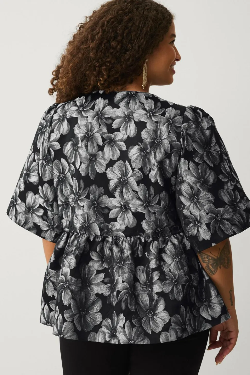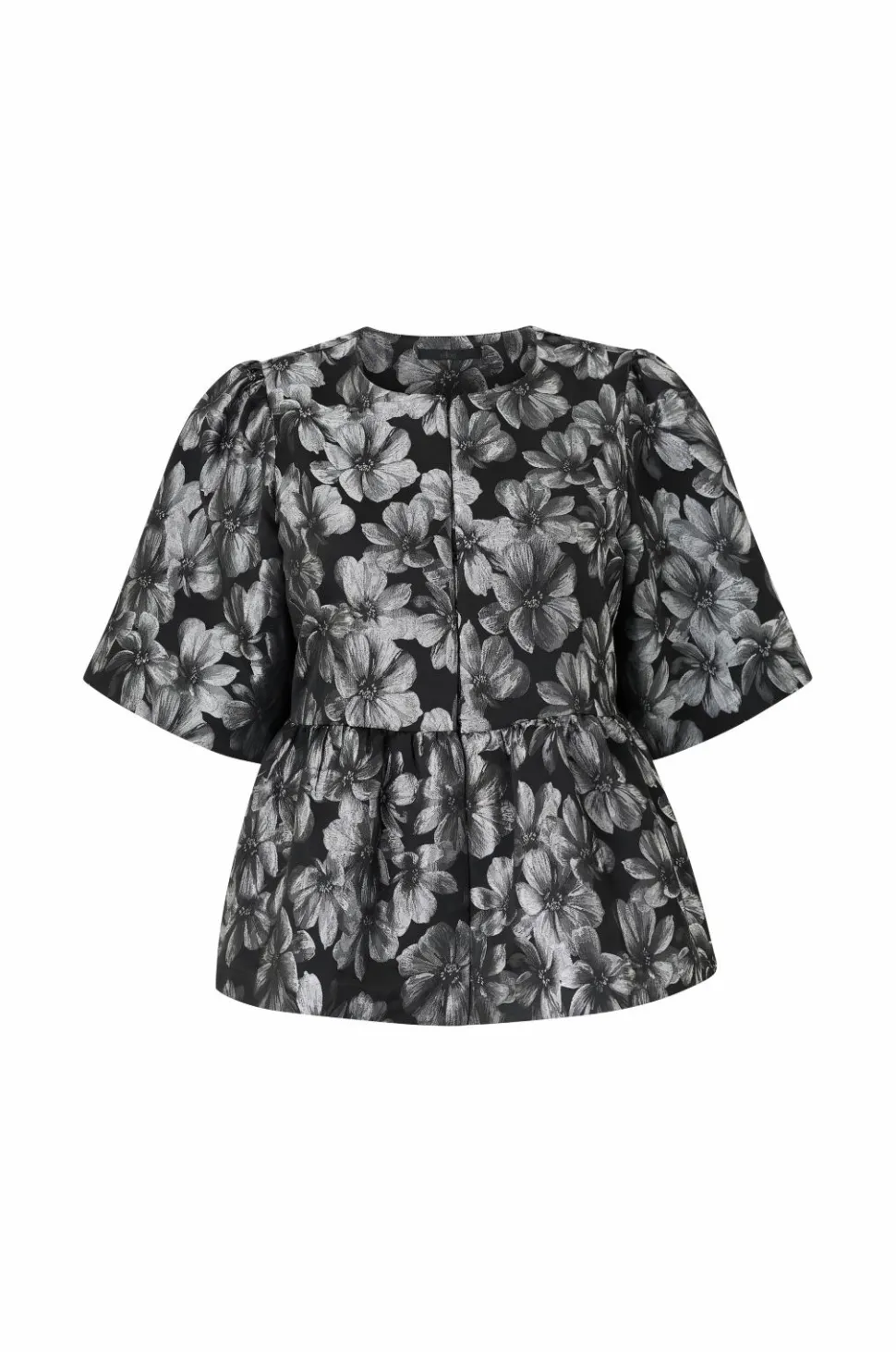 • Skinnende bluse i Taft med sølvagtige blomster hele vejen rundt