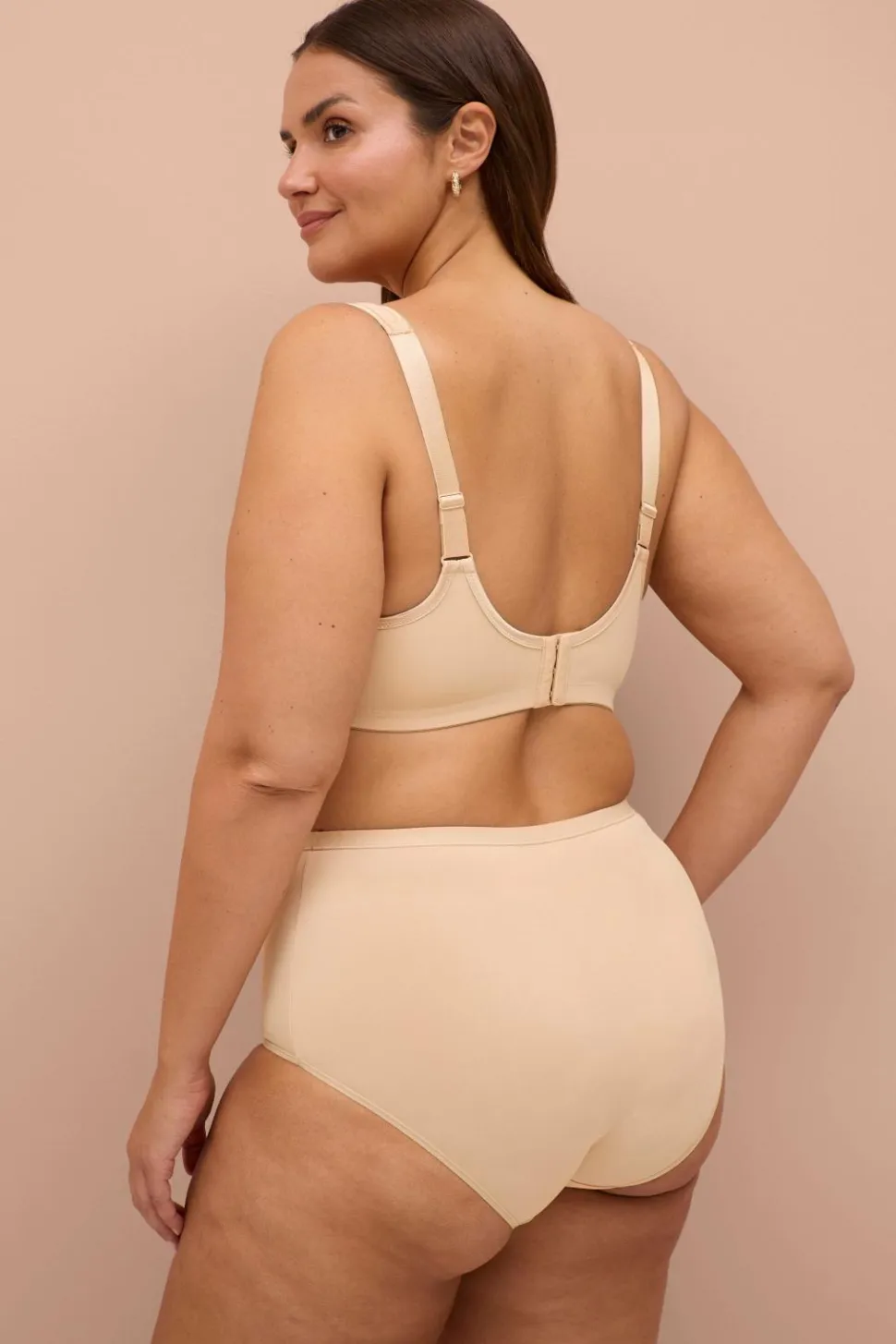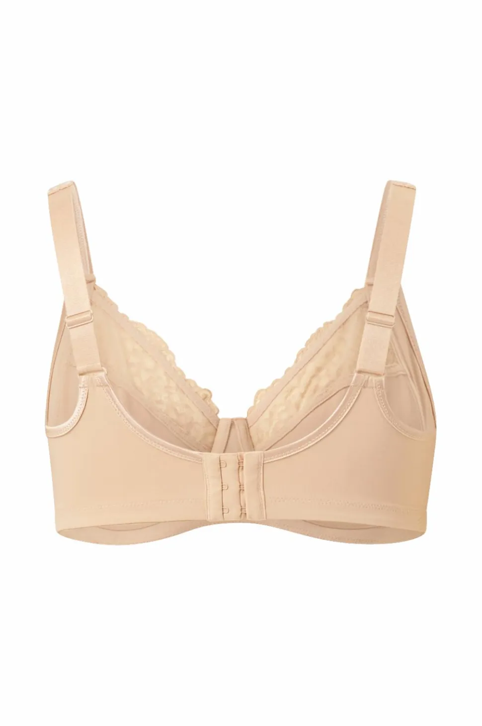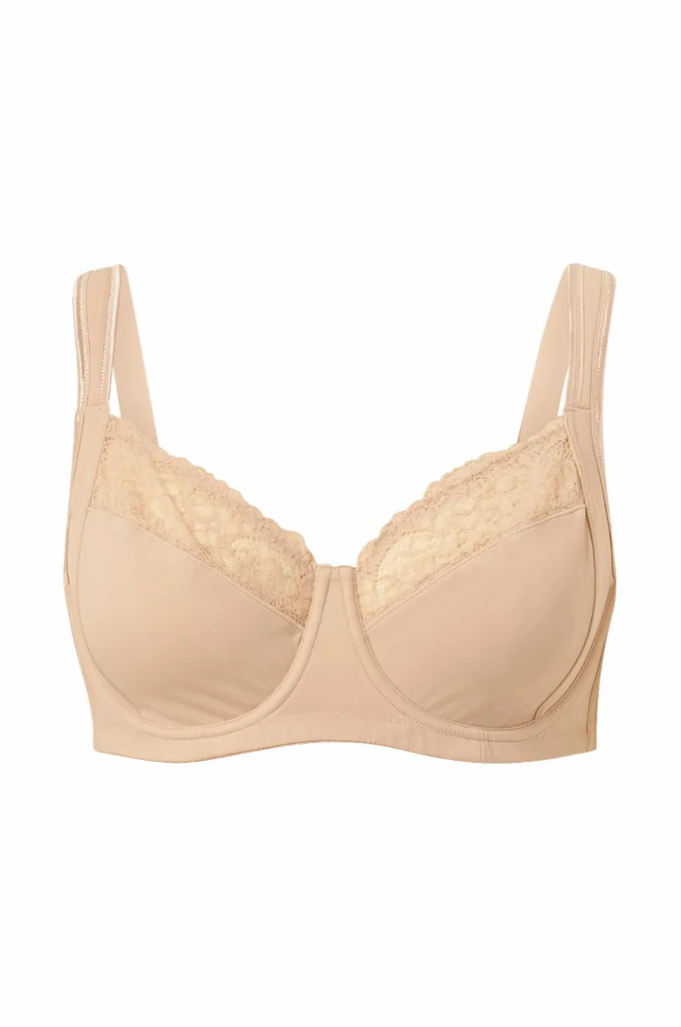 • Bøjle-bh med bløde, upolstrede skåle med blonder foroven. Brede, vatterede skulderstropper og brede bagskåle med blødt for.