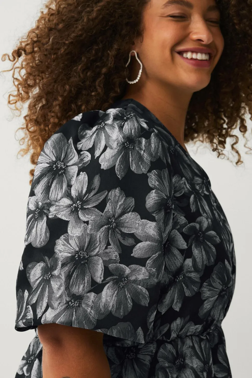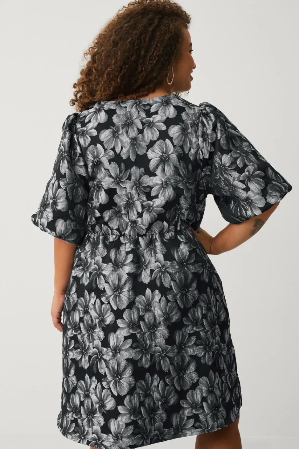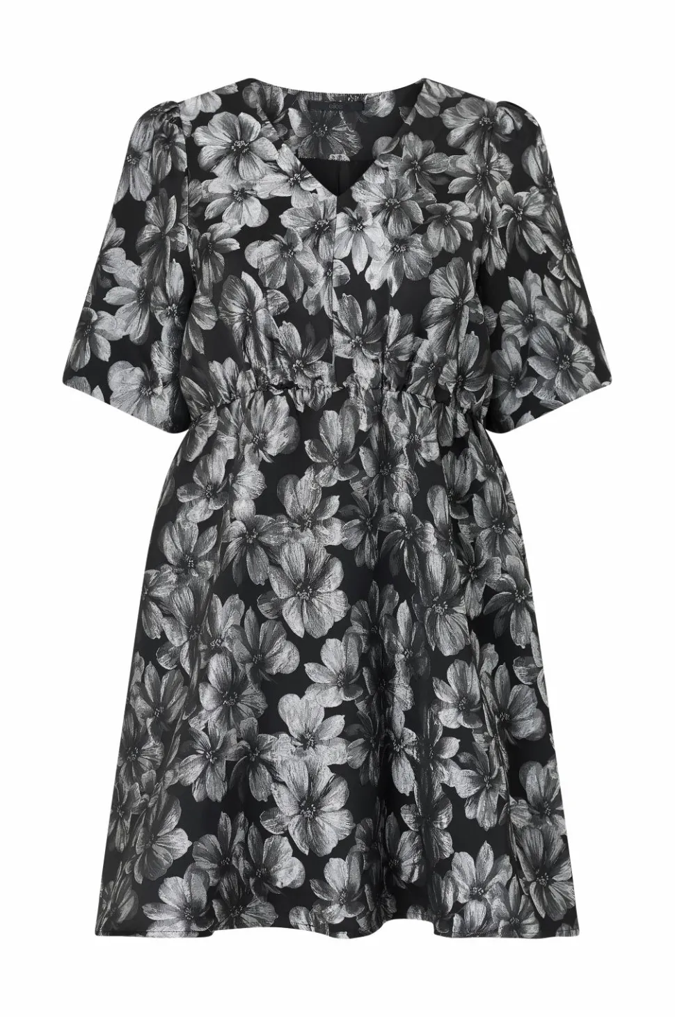 • Kjole i Taft med sølvagtige blomster hele vejen rundt