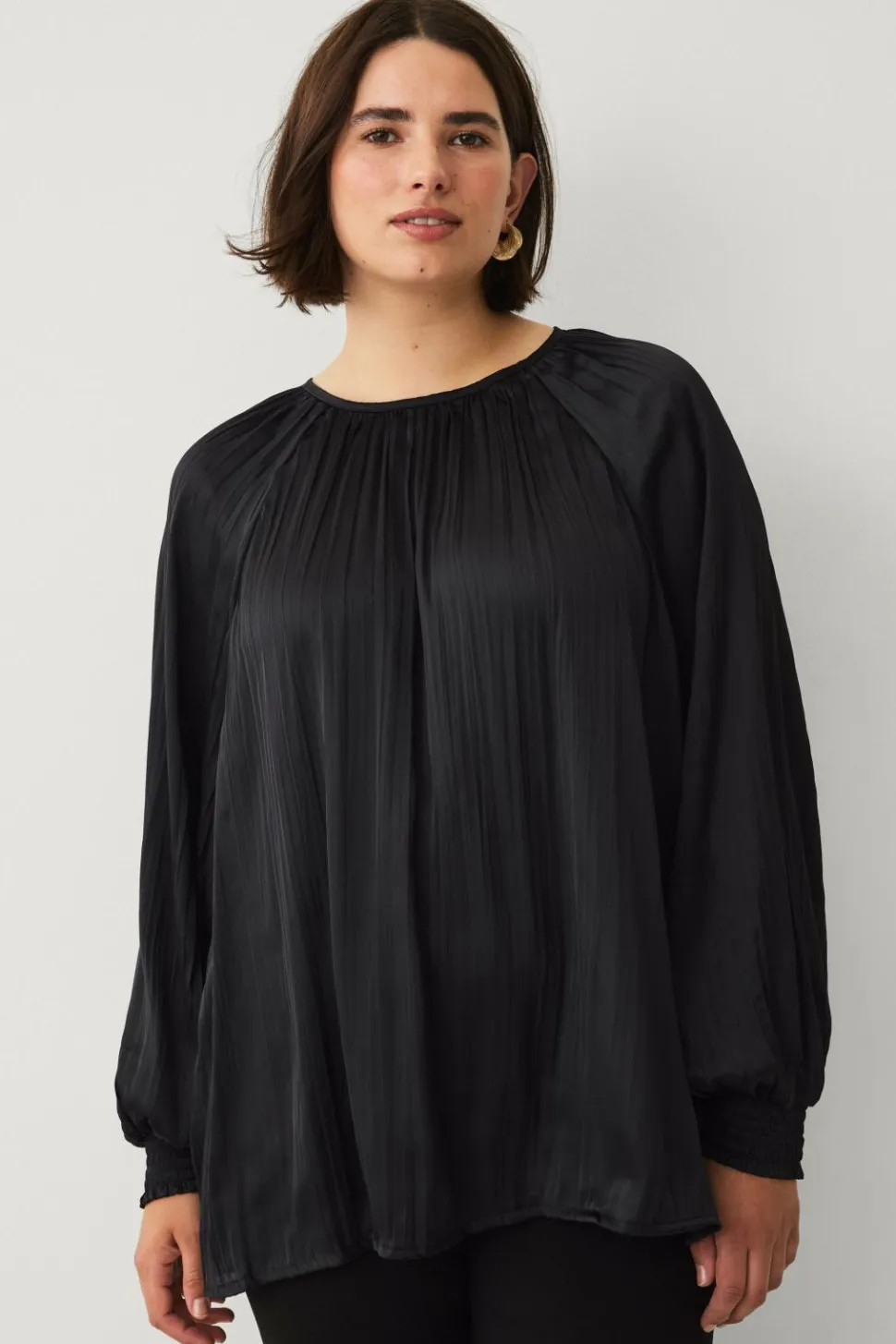 • Langærmet, plisseret, skinnende bluse med nedsænkede arme