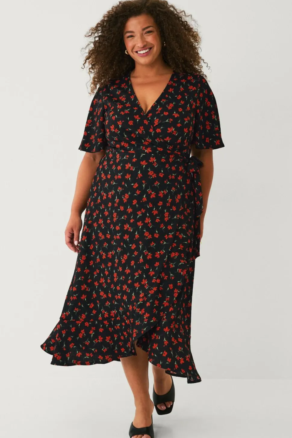 • Maxi-model i crepe med bindebånd ved taljen og elastik bagpå