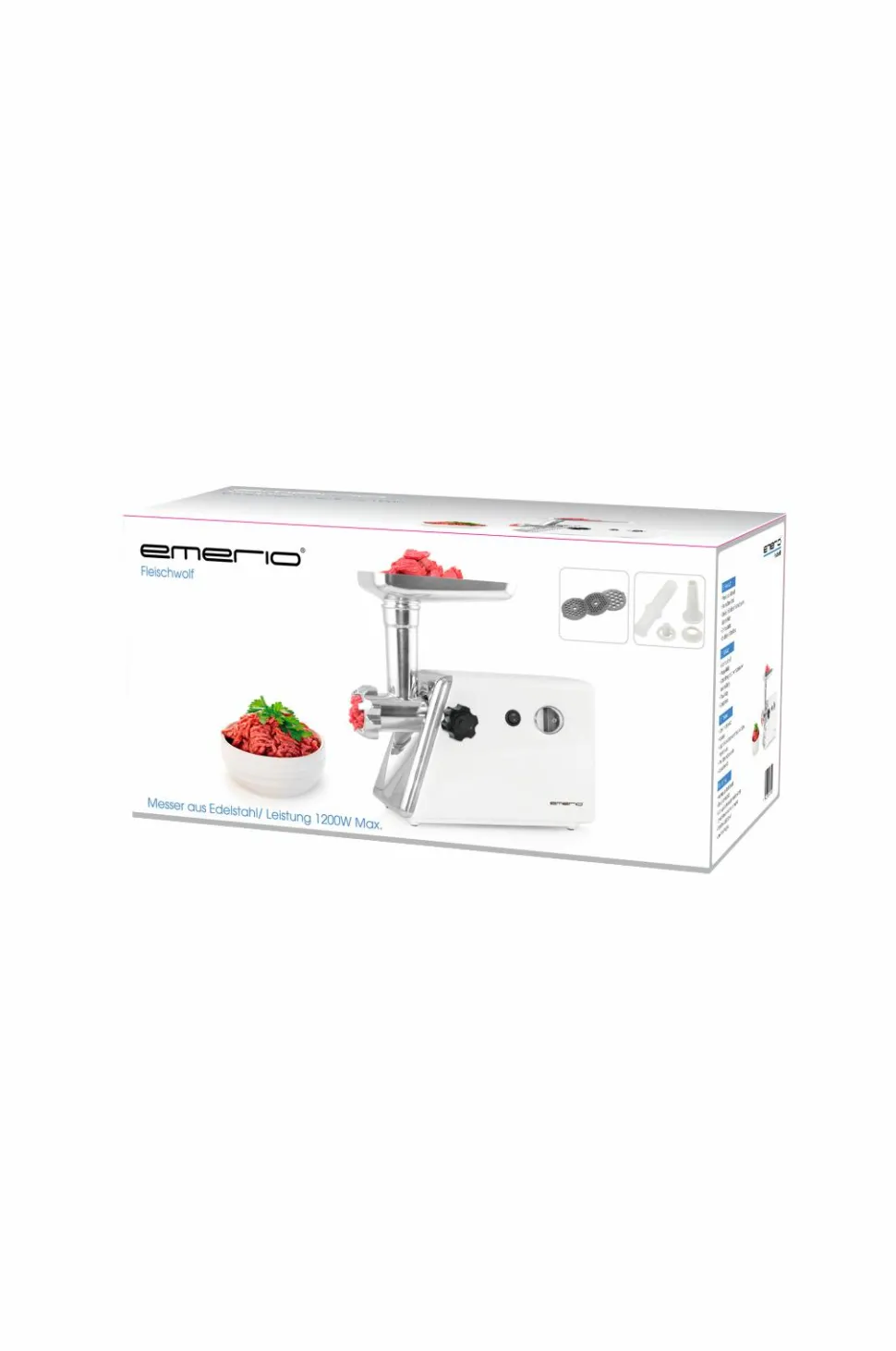 Denne kødhakker kan hakke kød til fars og pølser på få sekunder! Med 3 rustfri slibeskiver, hvor du kan vælge din favorit hakkefinhed; fin, medium eller grov. Let at rengøre, da alle dele er aftagelige.- 3 rustfri stål slibeskiver- Baglænsfunktion- Strømafbryder- Pølseudstopper- Blad i rustfrit stål- Topydelse: 1200 watt- Effekt: 450 watt- Gummifødder for stabil brug