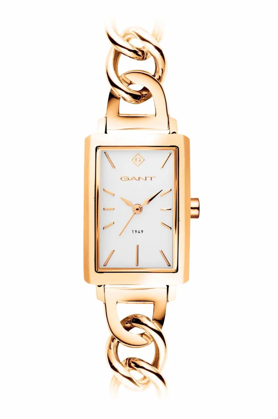 Gant Utica er et trendy smykkeur, som er et ægte blikfang. Den guldfarvede urkasse, 20 mm stålkonstruktion og hvide urskive giver tidløs elegance – og kombinerer mode og funktion.