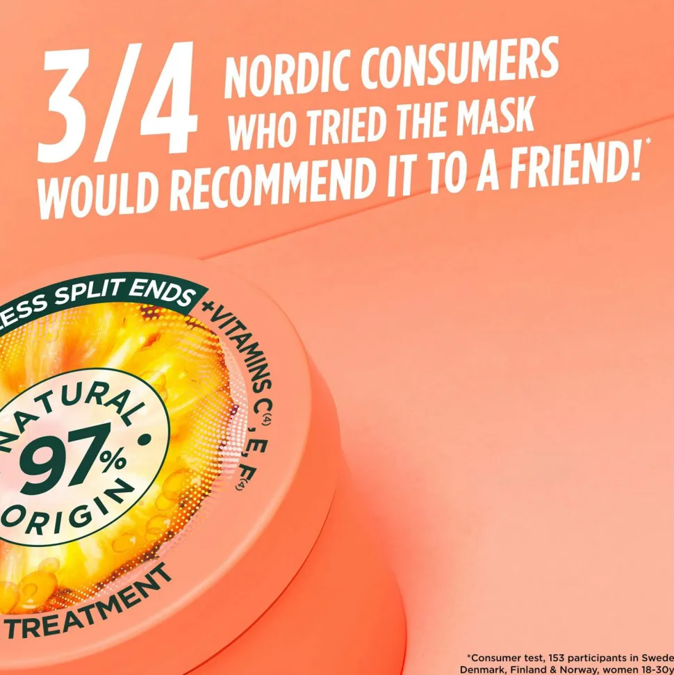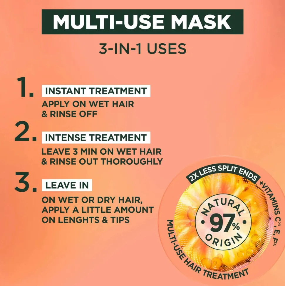 “Garnier Fructis Hair Food Pineapple Glowing Lengths 3-in-1 Multi-Use Treatment er en hårmaske til langt hår som ser kedeligt ud. Formlen giver intens glans og næring til dit lange hår, og gør det nemt at rede ud. Resultatet? 2x færre spaltede spidser*! Den veganske formel** er beriget med omega 6 og 9 samt vitamin C + F-derivater og E-vitamin.
