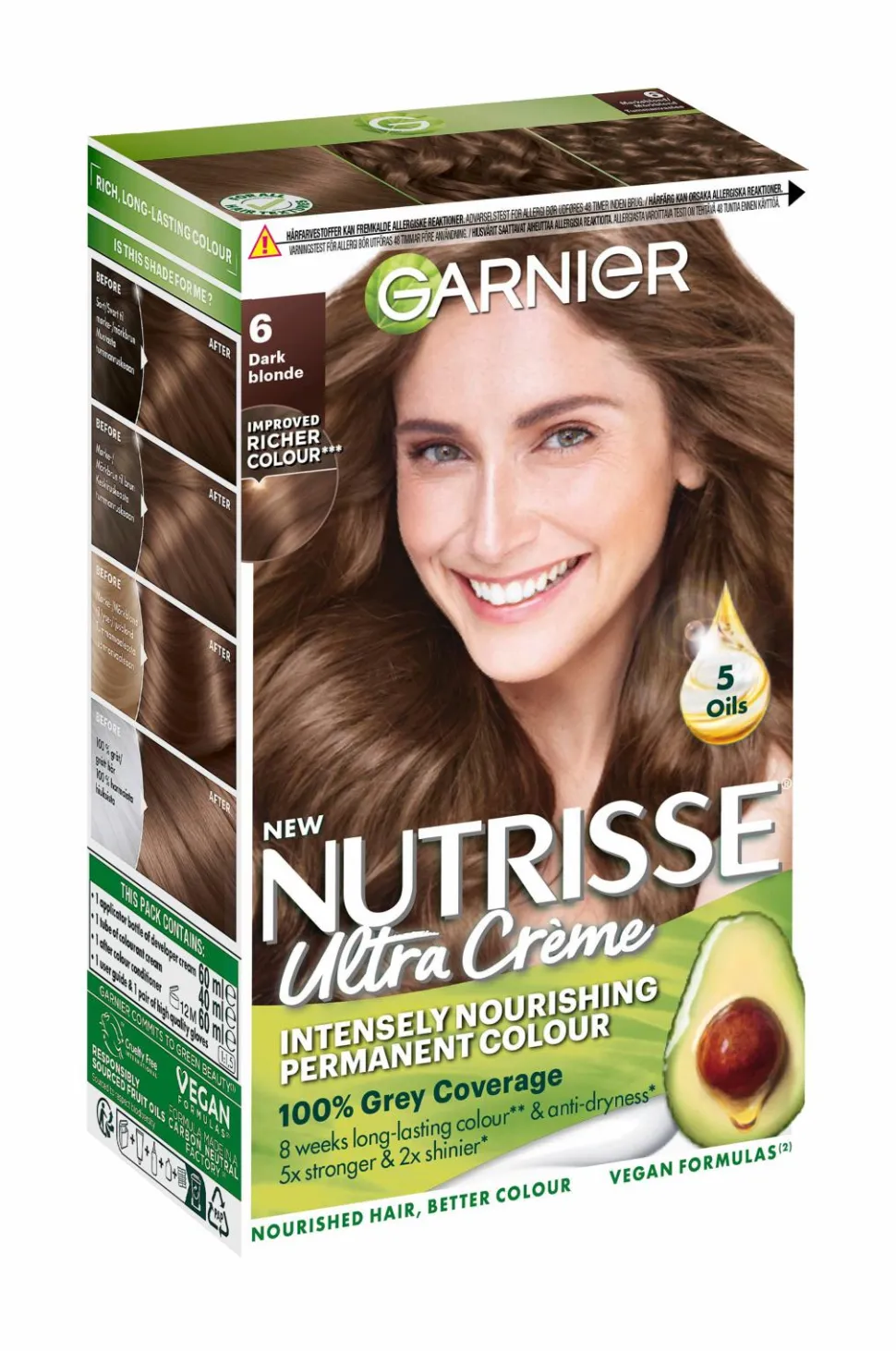 Hårfarvningsmidler kan fremkalde alvorlige allergiske reaktioner. Læs brugsanvisningen, og følg den nøje. Produktet er ikke beregnet til brug på børn under 16 år. Farv ikke håret, hvis du har udslæt i ansigtet eller følsom, irriteret og skadet hårbund, eller hvis du har reageret på hårfarvningsmidlerne tidligere.
