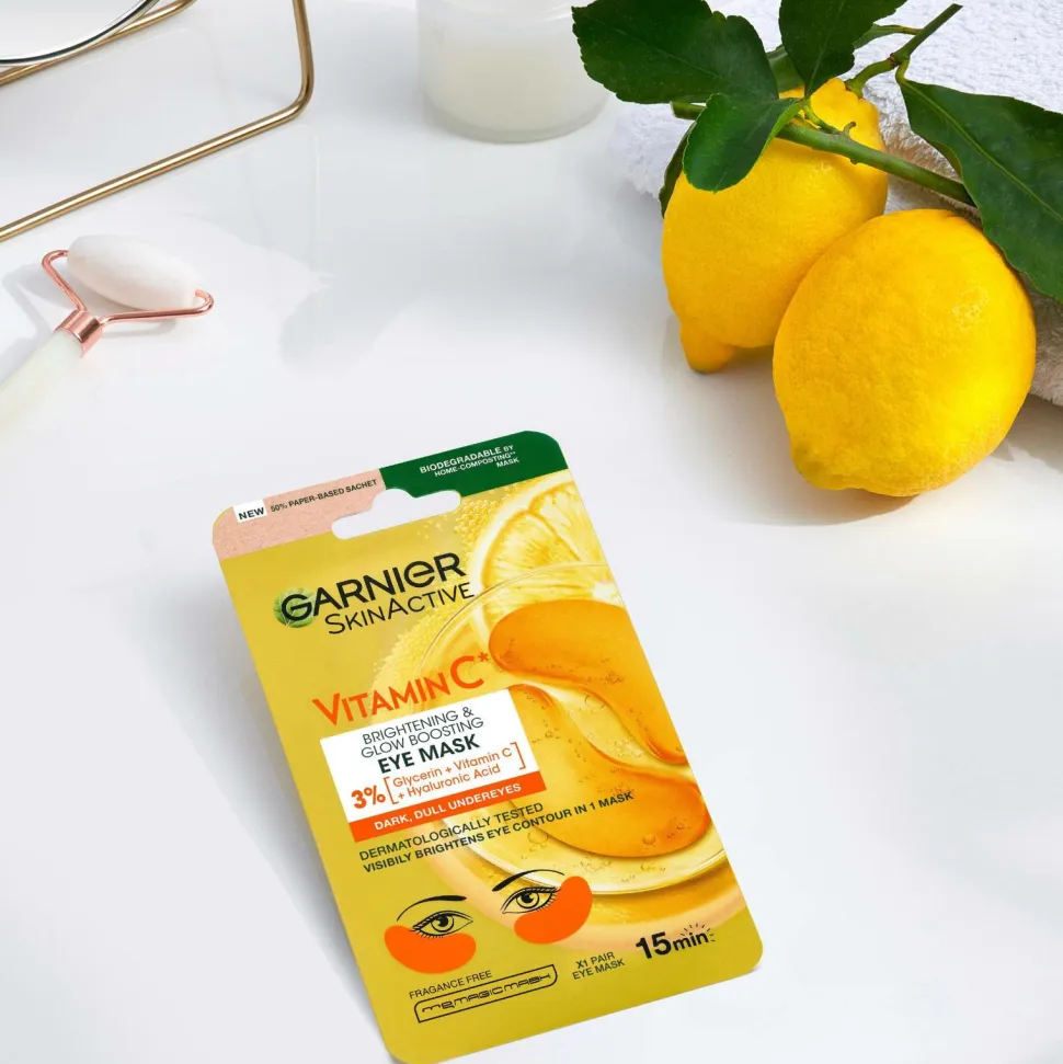 Garnier SkinActive Vitamin C* Brightening and Glow Boosting øjenmasker hjælper dig med mat og trist hud rundt øjnene. Formlen er beriget med C-vitamin*, glycerin og hyaluronsyre, og får øjenområdet til at fremstå mere klart og vågent for et opfrisket look. Vegansk formel**.