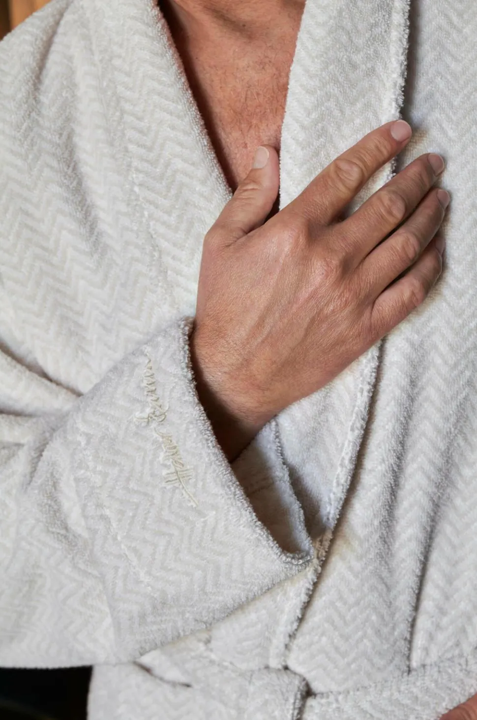 Luksuriøs jacquardvævet badekåbe fra Halvor bakke i 100 % garnfarvet bomuldsfrotté. Samme design fås i et håndklæde. Verbier-badekåberne er jacquardvævede i zero twist-garn, hvilket giver optimal absorption, og det diskrete tone-i-tone sildebensmønster giver tekstilet liv og dybde. Farverne supplerer efterårets varme palet perfekt og passer smukt sammen med clifton og la grave. 100% garnfarvet bomuldsfrotté. Jacquardvævet 350 g/m². Fås i størrelse s/m og l/xl. Leveres i flere farver. Brystlomme og sidelommer. Bælte i taljen. Badekåben er en del af Halvor Bakkes Bedtime Story kollektion.