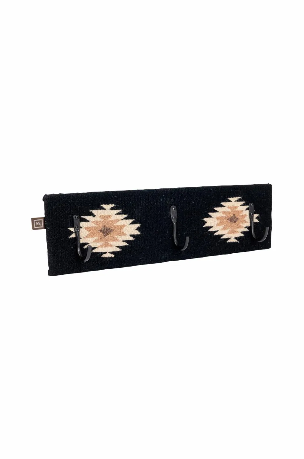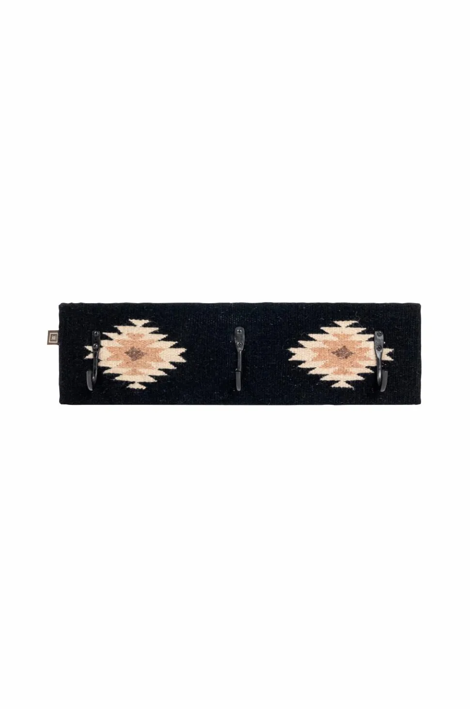 Knagerække betrukket med kelimstof i uld med beige/brunt mønster på sort baggrund. Med 3 kroge i metal.