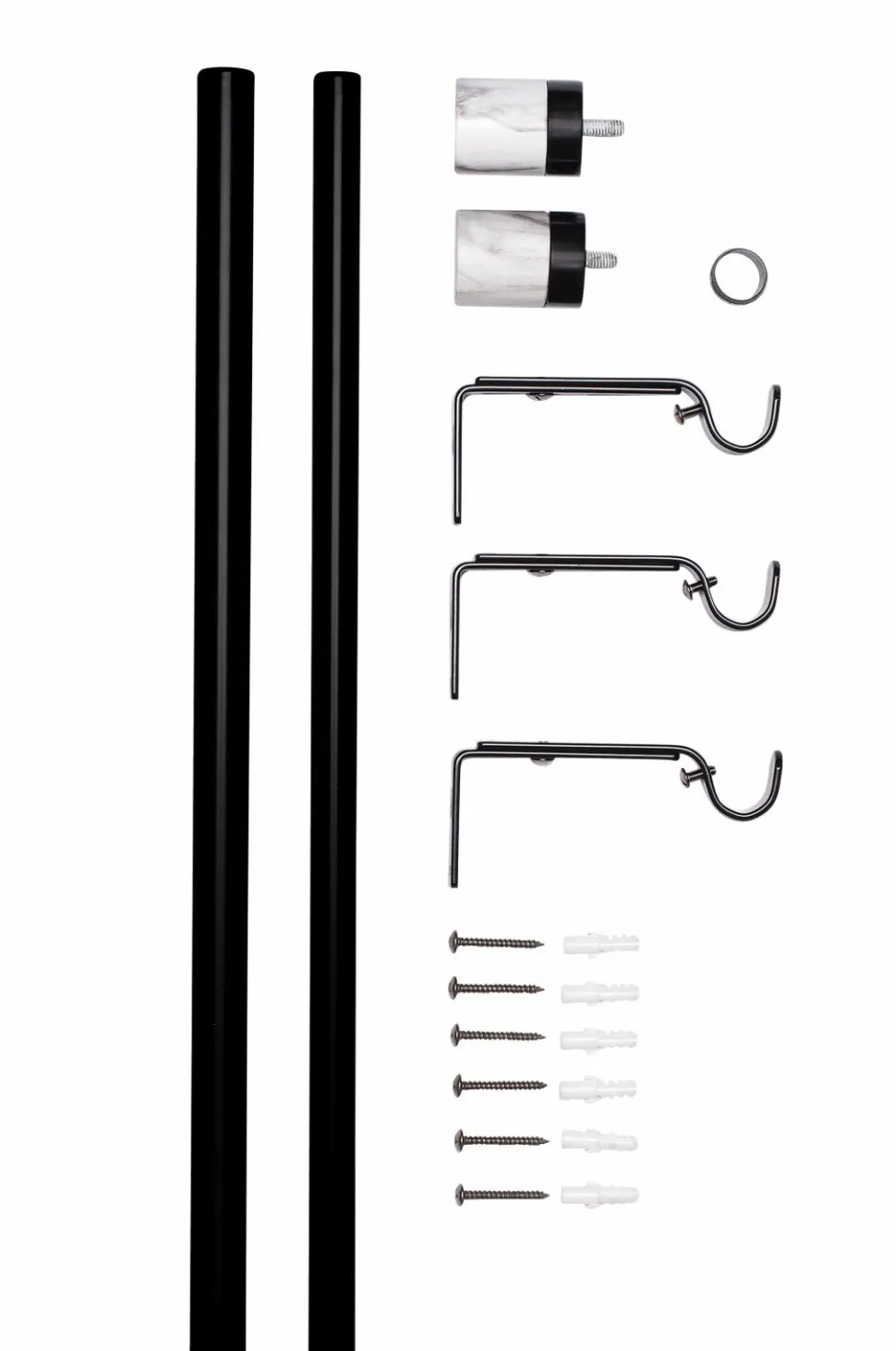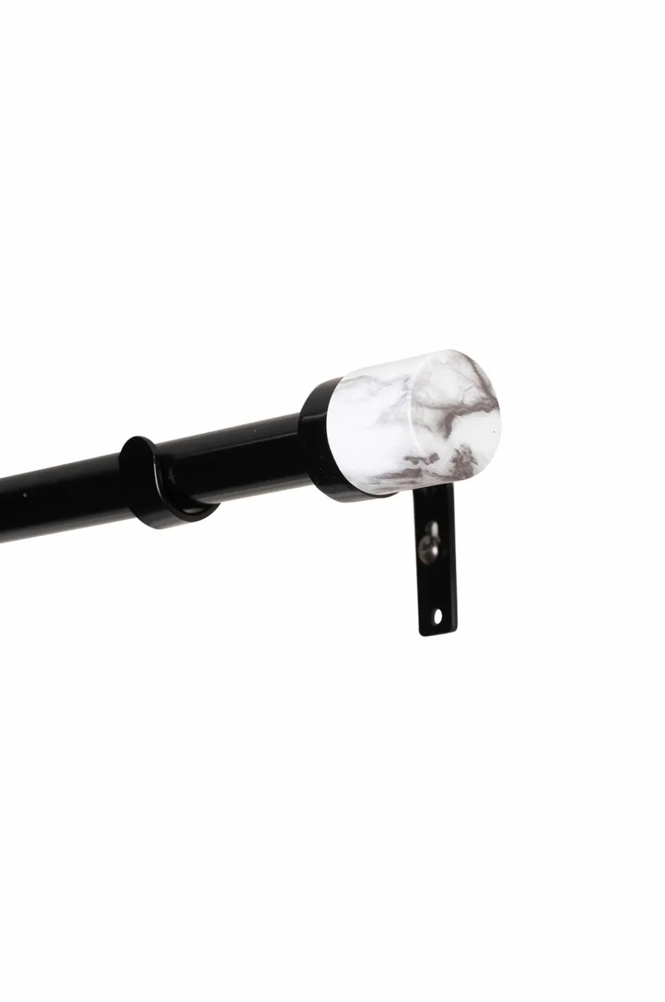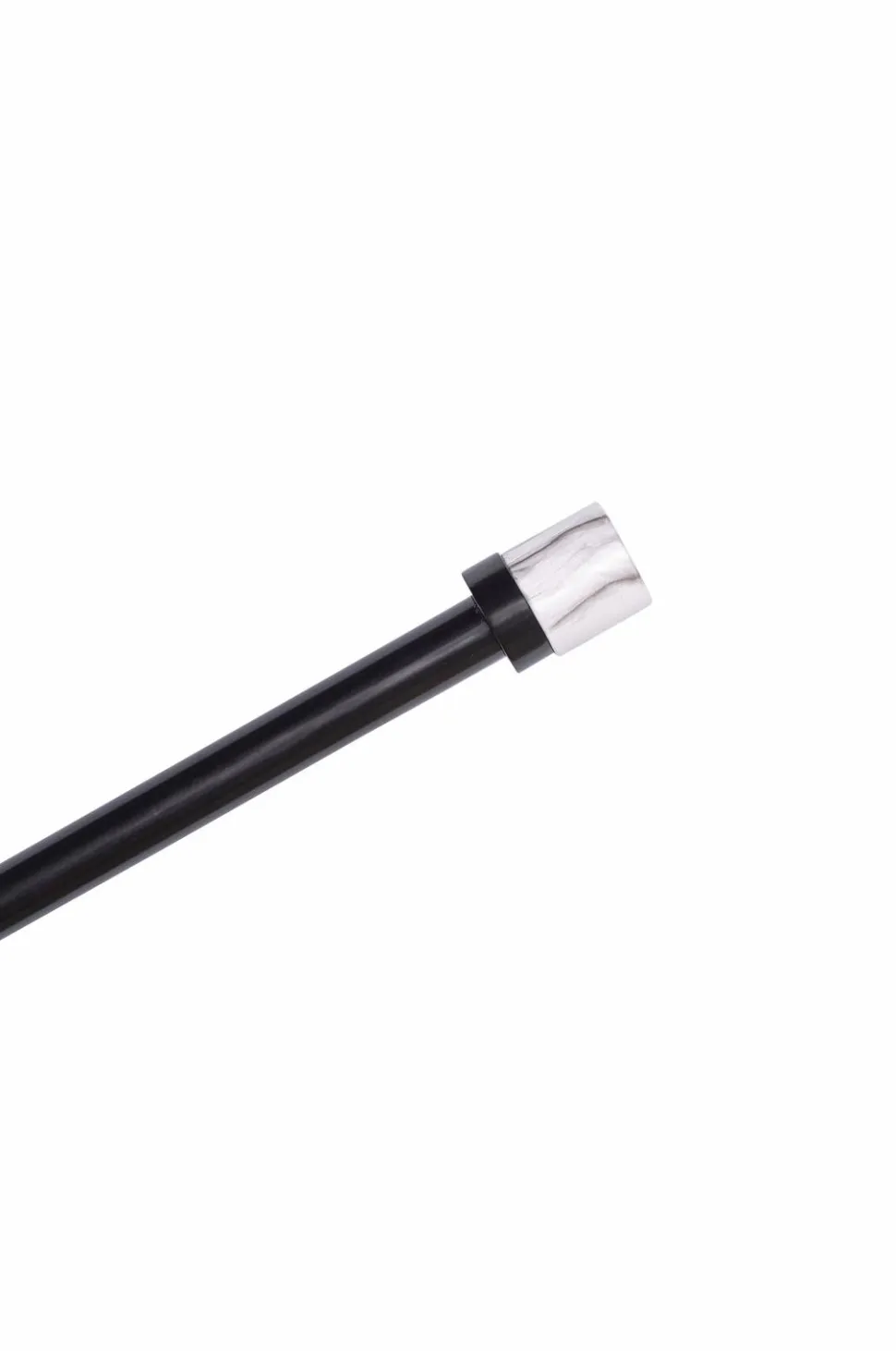 Komplet gardinstang i metal (16/19 mm) med dekorative finials i marmor. Sættet indeholder justerbare stænger (110-200 cm), 2 finials og 3 justerbare vægbeslag (7-9 cm).