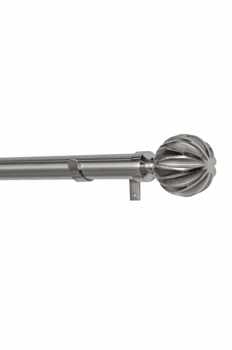 Komplet gardinstang i metal (25/28 mm) med dekorative finials. Sættet indeholder justerbare stænger (110-200 cm), 2 finials og 3 justerbare vægbeslag (7-9 cm).
