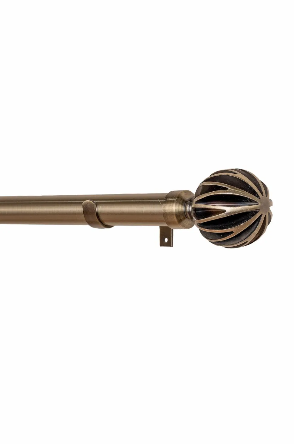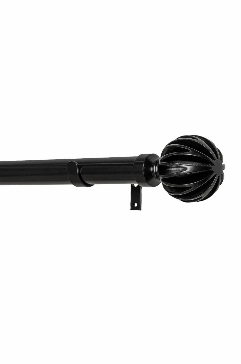 Komplet gardinstang i metal (25/28 mm) med dekorative finials. Sættet indeholder justerbare stænger (110-200 cm), 2 finials og 3 justerbare vægbeslag (7-9 cm).