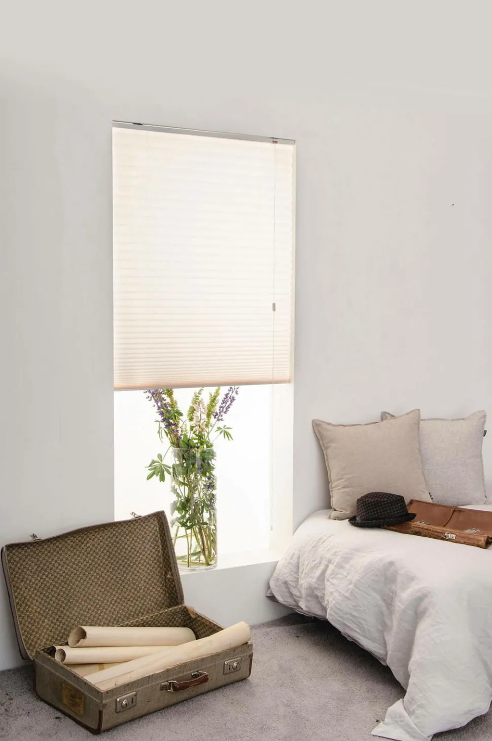 Frithængende plisségardin. Til lodrette vinduer. Reguleres med træksnor med bremse. Let at montere med drejebeslag på væg eller i loft. Beslag medfølger. Længde 160 cm.