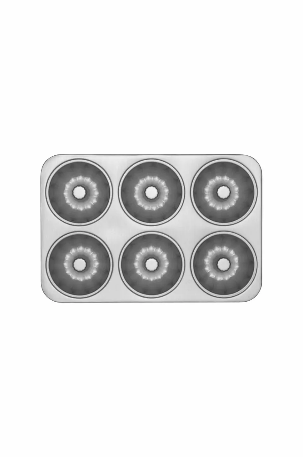 Bageform i støbt aluminium, der skaber seks kager i portionsstørrelse.