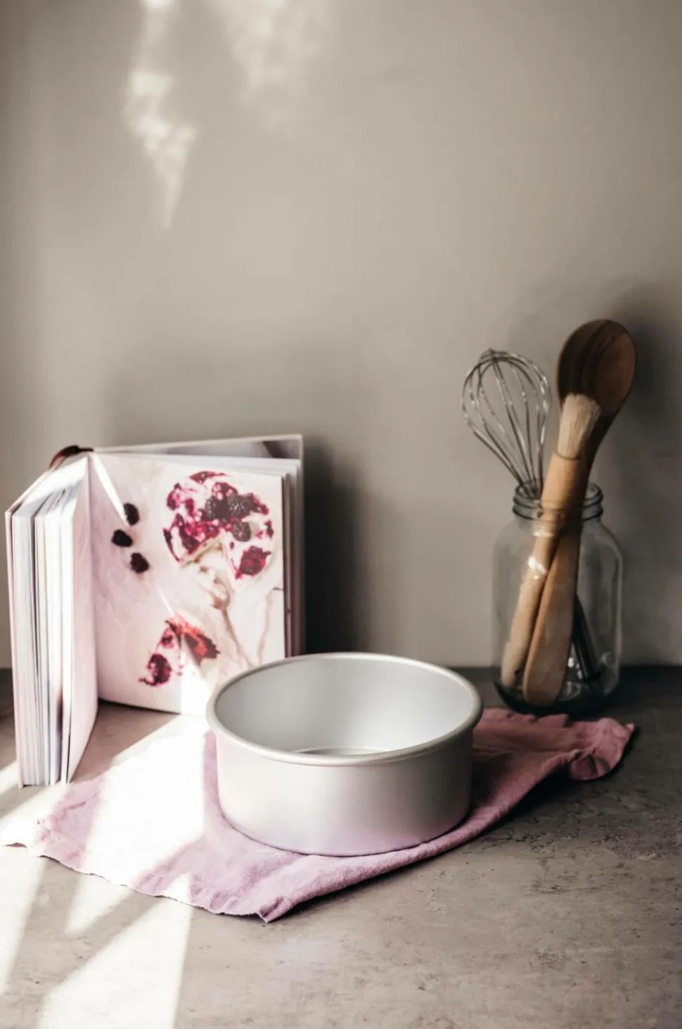Rund bageplade af anodiseret aluminium. Aluminium giver fremragende varmeledning og et jævnt resultat. Panden er 7,5 cm høj og har en kapacitet på 1,3 liter.