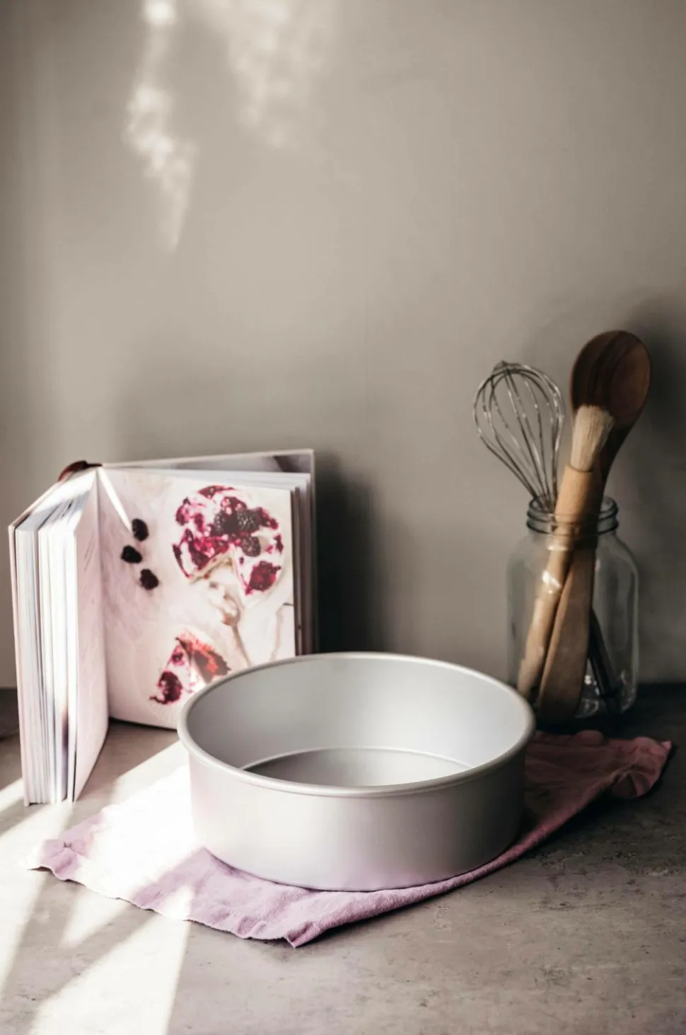 Rund bageplade af anodiseret aluminium. Aluminium giver fremragende varmeledning og et jævnt resultat. Panden er 7,5 cm høj og har en kapacitet på 2,3 liter.