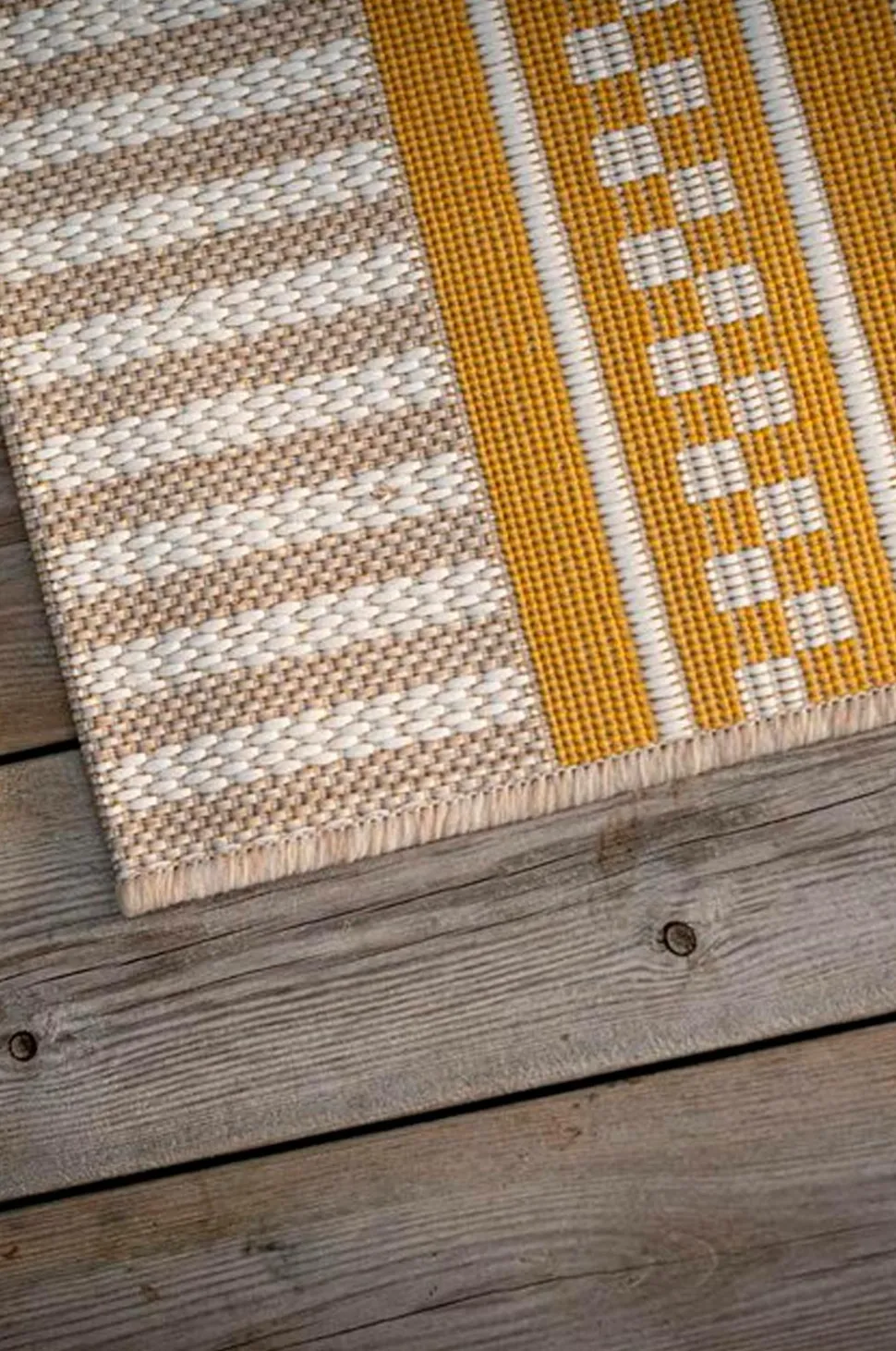Mønstret udendørstæppe i et moderne udtryk med et detaljeret mønster i gul kontrastfarve. Stoffet har en glat struktur med et tåleligt stribet udtryk. Forstærk rumfornemmelsen og skab en hyggelig terrasse eller altan.
