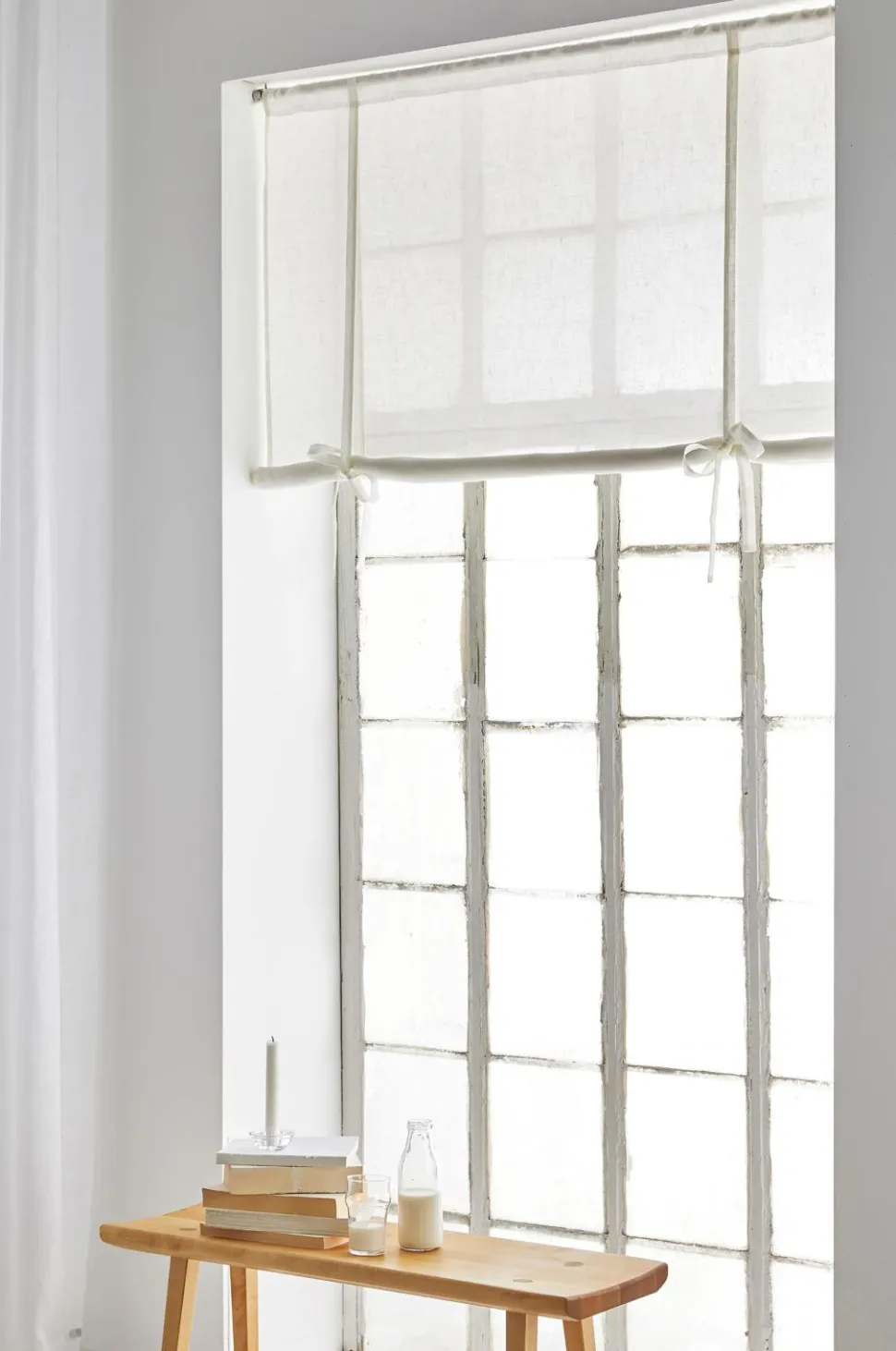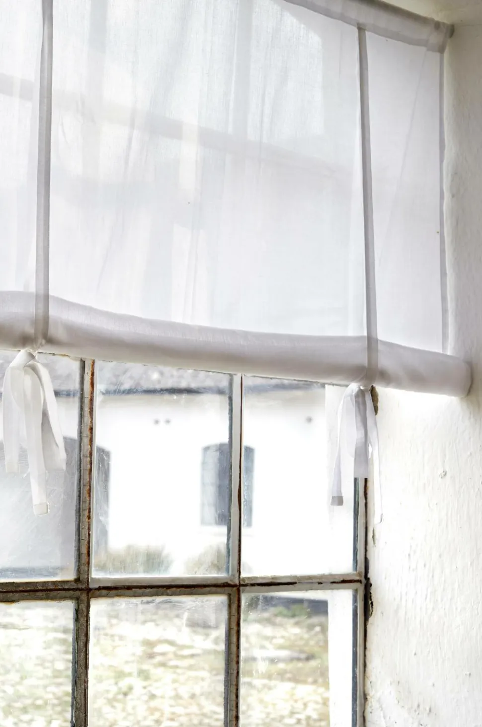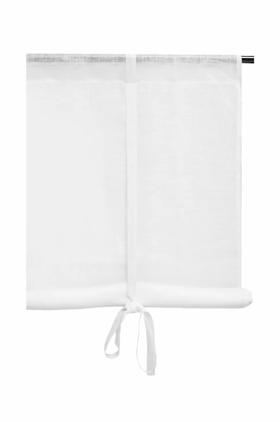Gardinet er udstyret med en 6 cm bred kanal i toppen og egner sig bedst til en traditionel gardinstang. De to bånd er placeret i hver side af gardinet, 21-22 cm fra kanten. Rul gardinet op nedefra, og bind båndene rundt om stofrullen i den ønskede længde. Hvis du vil have en glattere rulle, er du velkommen til at sætte en lang blomsterpind i, når du ruller op.