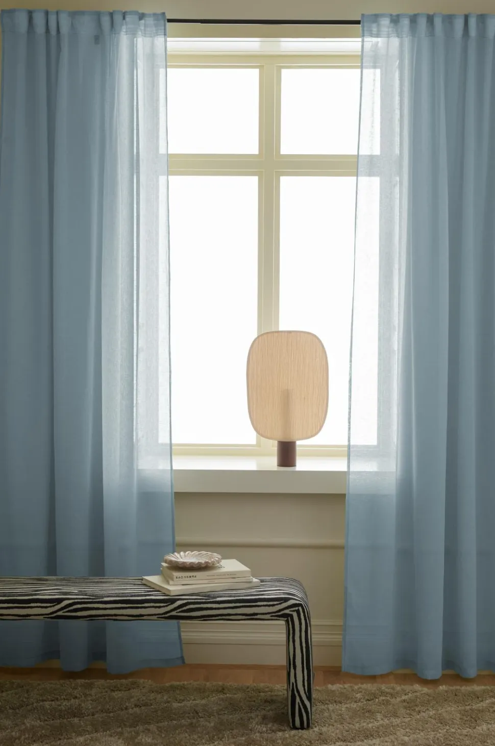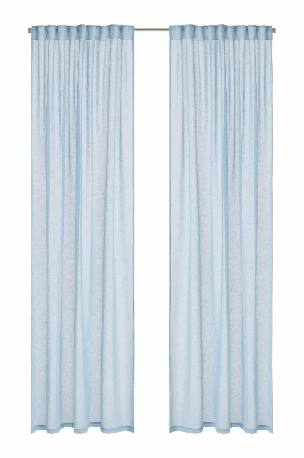 To multibåndsgardiner i løst vævet hørlook i blød, genindvundet polyester. Multibåndet gør, at du enten kan hænge gardinerne direkte på en gardinstang gennem de skjulte stropper eller anvende ringe, nålekroge eller fingerkroge. Snoren i rynkebåndet gør, at du let kan skabe ensartede, flotte læg.