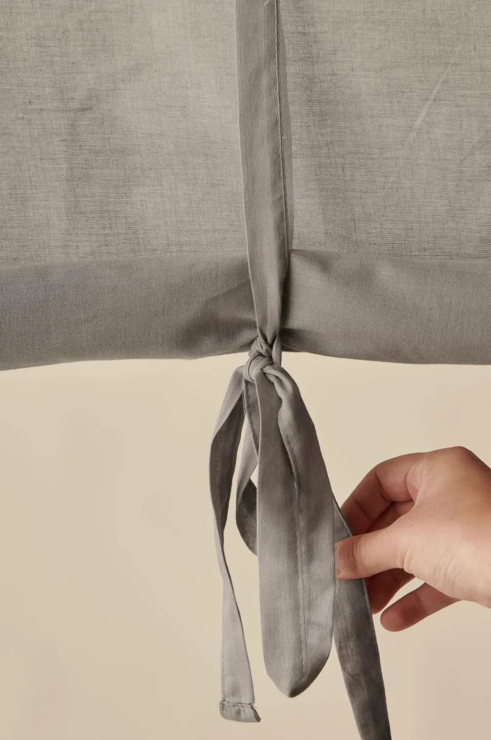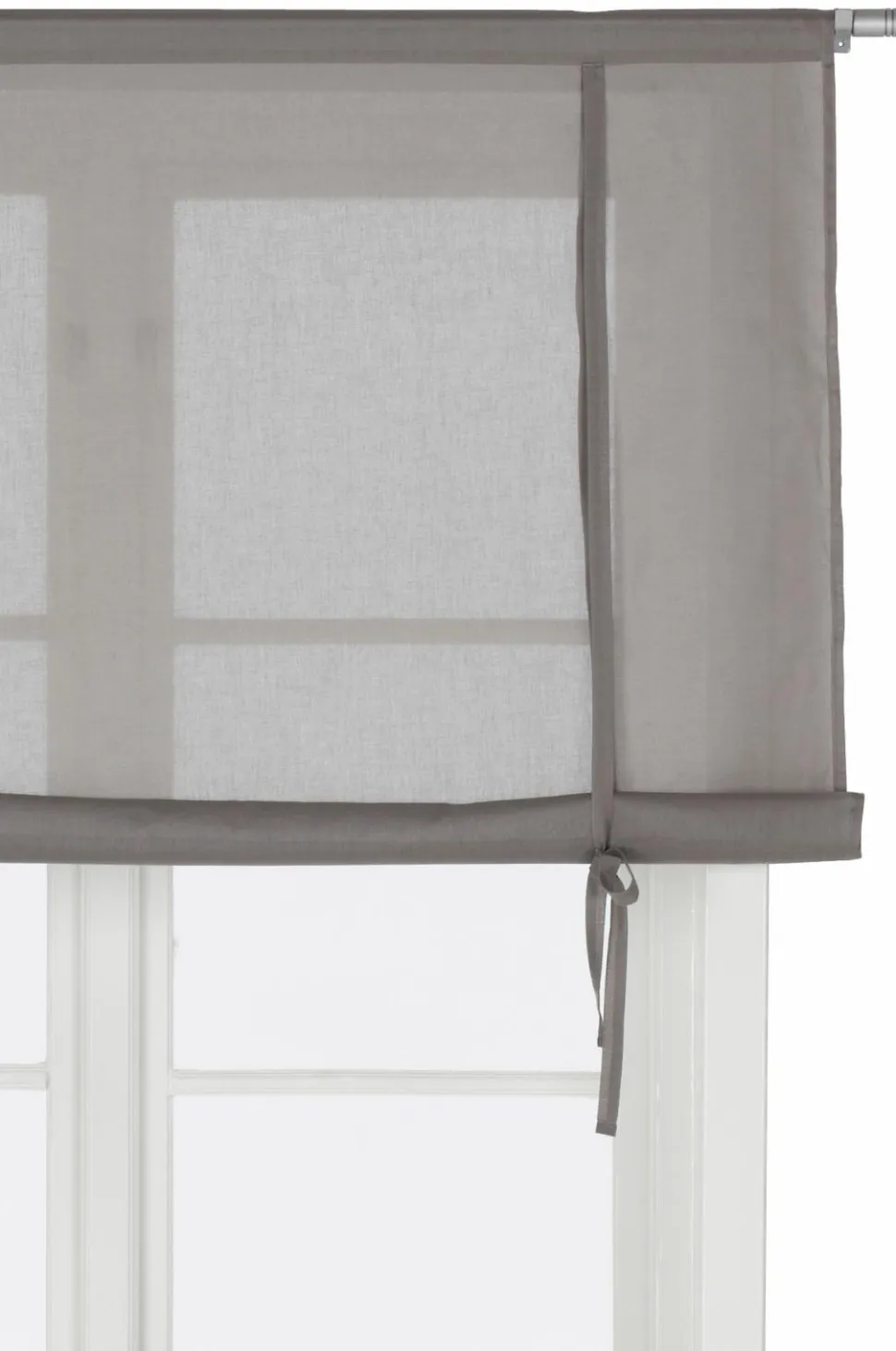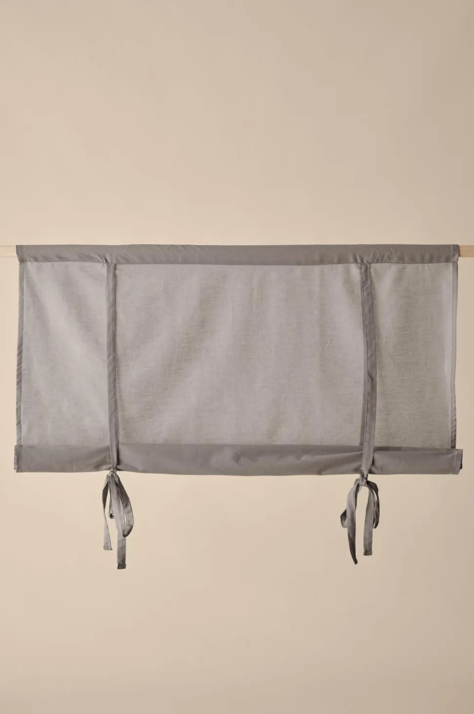 Af bomuldsvoile med løbegang foroven (trædes på gardinstangen). Rulles op med to bindebånd. Længde 100 cm. Findes i fire bredder: 80, 100, 120 og 140 cm.