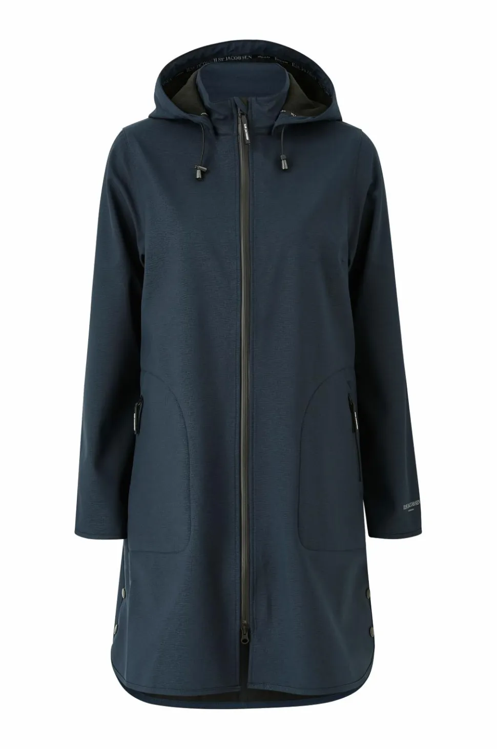 Regnfrakke fra Ilse Jacobsen med A-formet silhuet, i blødt og åndbart softshellmateriale. Vandsøjletryk 5000 mm og åndbarhed 3000 g/m2/24h. Alle sømme er tapede for at holde vand ude. Indersiden er i blød fleece. Aftagelig hætte som har løbegang og stop. Høj krave og 2-vejslynlås fra YKK. To lommer med lynlås. Justerbar vidde i ærmekant med trykknapper. Sideslids som kan lukkes/åbnes med trykknapper. Længde ca. 101 cm i str. 36.