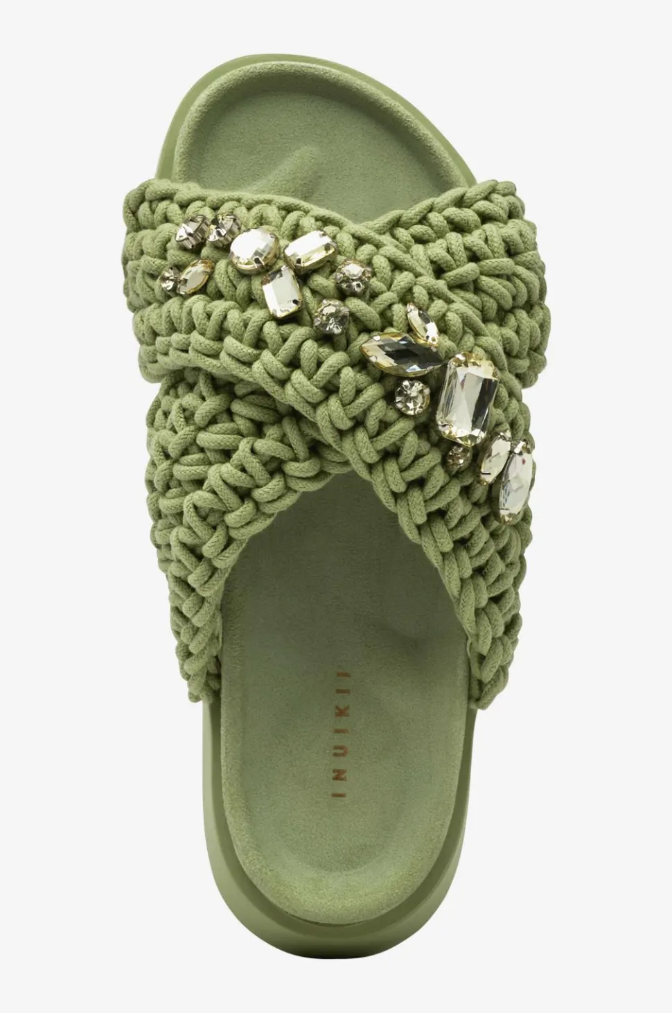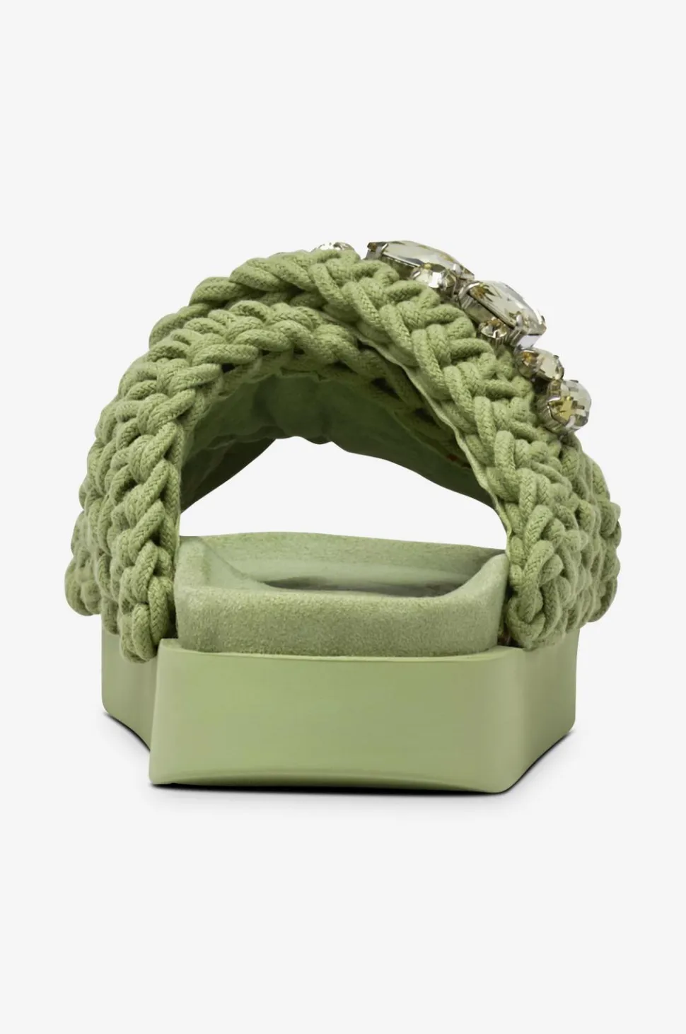 • Brede, krydsende remme i flettet tekstil med dekorative sten