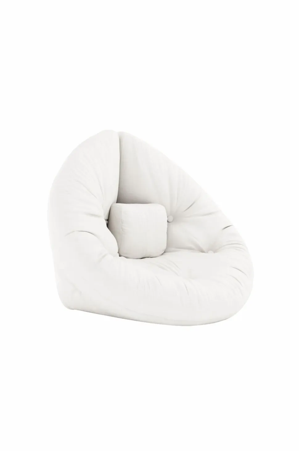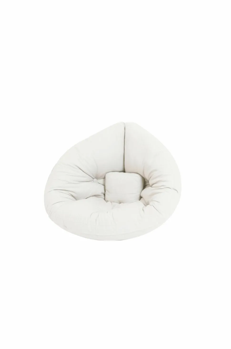 Read . Unstrap . Play – Mini Nido er perfekt til krudtugler, som her får et personligt rum. Løsn de fire velcro stropper på bagsiden af Mini Nido, og det bliver hurtigt en halvmåne-futon, velegnet til en lur, som improviseret seng eller det perfekte legested. Sæt to åbne Mini Nidos sammen, og skab en indbydende cirkelrund seng, hvor barnet kan nyde både leg og afslapning. Design af Anders Backe, Anne-Sofie Voss, Ida Sofie Lange, Lars Wigh og Troels Rask Pedersen for Karup Design.