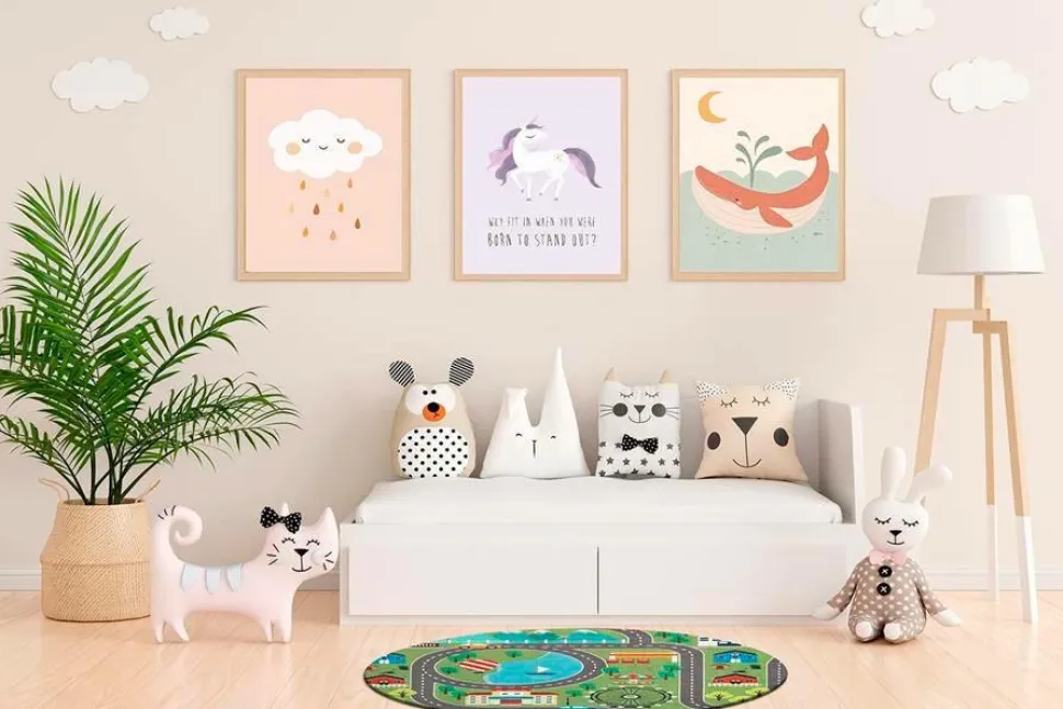 De er lette og nemme at håndtere, da de kun er 5 mm, ingen kant at snuble over. Skulle uheldet være ude, passer det nemt i maskinen og kan vaskes ved op til 30 °C. Et legende stænk af farve til børneværelset.