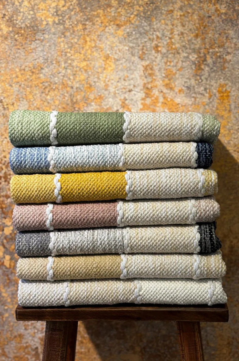 Stribede garntæpper kan håndvaskes i koldt vand med sæbe eller et mildt rengøringsmiddel. Skrub forsigtigt med en blød børste i stribernes retning på begge sider, og skyl derefter grundigt.