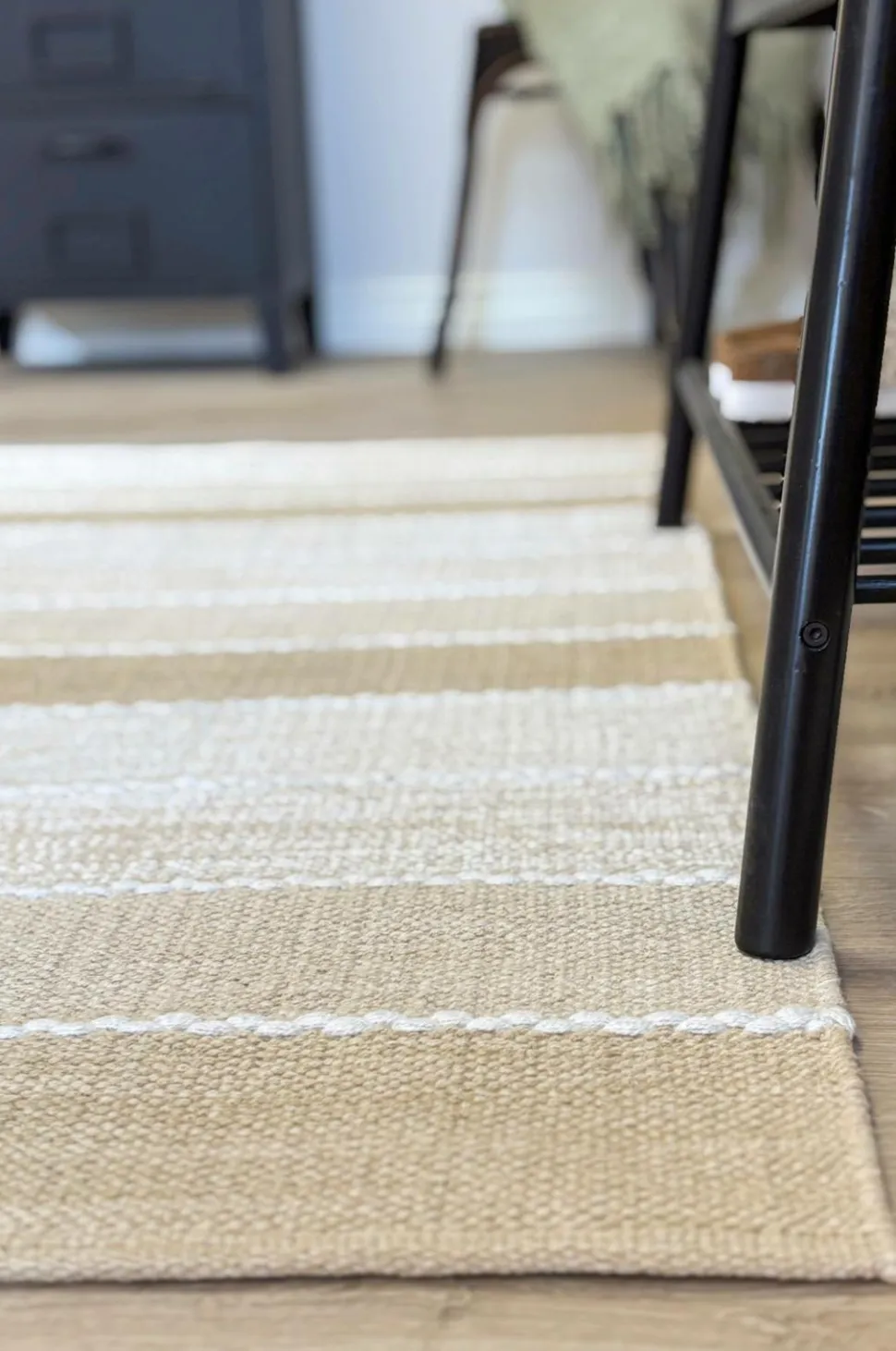 Lad tæppet tørre fladt, eller hæng det op i stribernes retning med flere linjer som støtte.