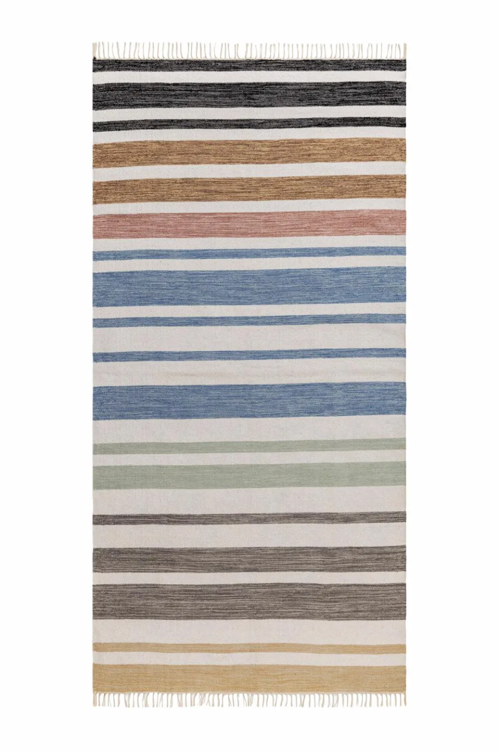 pastell multi er et smukt håndvævet garntæppe med en blød farvegradient, der går fra dybe til lyse pastelfarver. Hvide striber bryder mønsteret uregelmæssigt op og fremhæver nuancerne, mens kanterne er prydet med matchende beige frynser for et klassisk og elegant look.