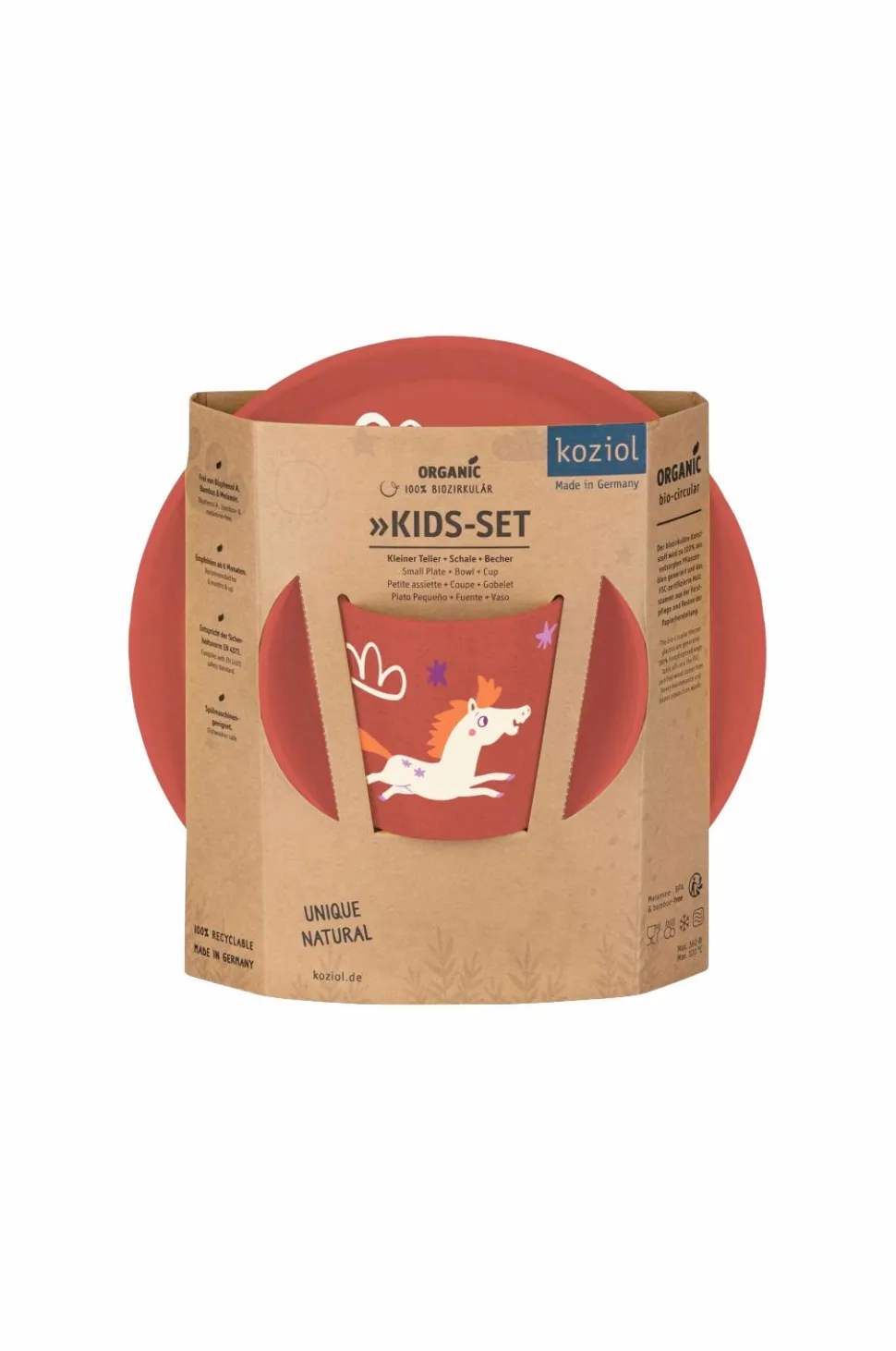 Connect Børneservice med tallerken, skål og krus. Den farverige børnekollektion inspirerer med muntre mønstre og kærlige detaljer, der gør hvert måltid til en oplevelse. Alle produkter er børnevenlige, holdbare, stabile, nemme at bruge og nemme at passe på. Alle produkter er fødevaregodkendte. Mål: kop 7,5 x 7,5 x 7,5 cm / skål: 12,5 x 12,5 x 5,5 cm / tallerken: 20,5 x 20,5 x 2,0 cm. Materiale: termoplast og træfiber, 100 % genbrugsmateriale. Vejledning: tåler opvaskemaskine.