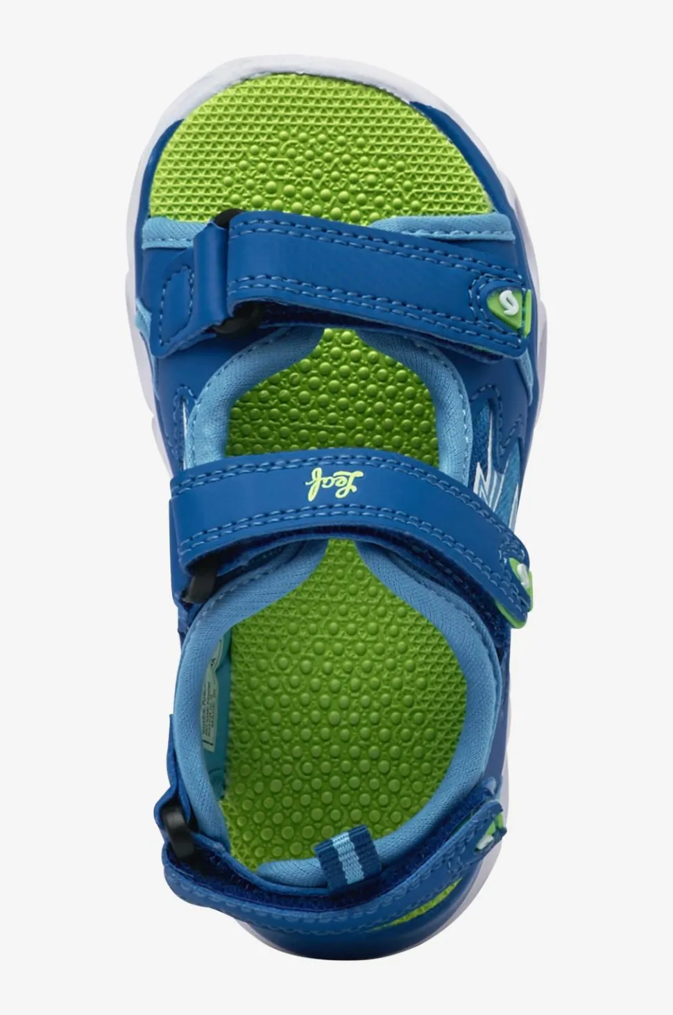 • Blinkende lys på ydersiden af sålen. Lysene blinker, når foden sættes ned.