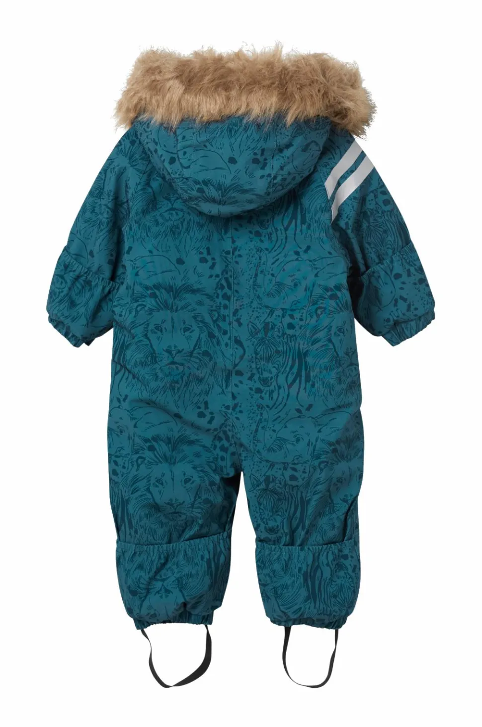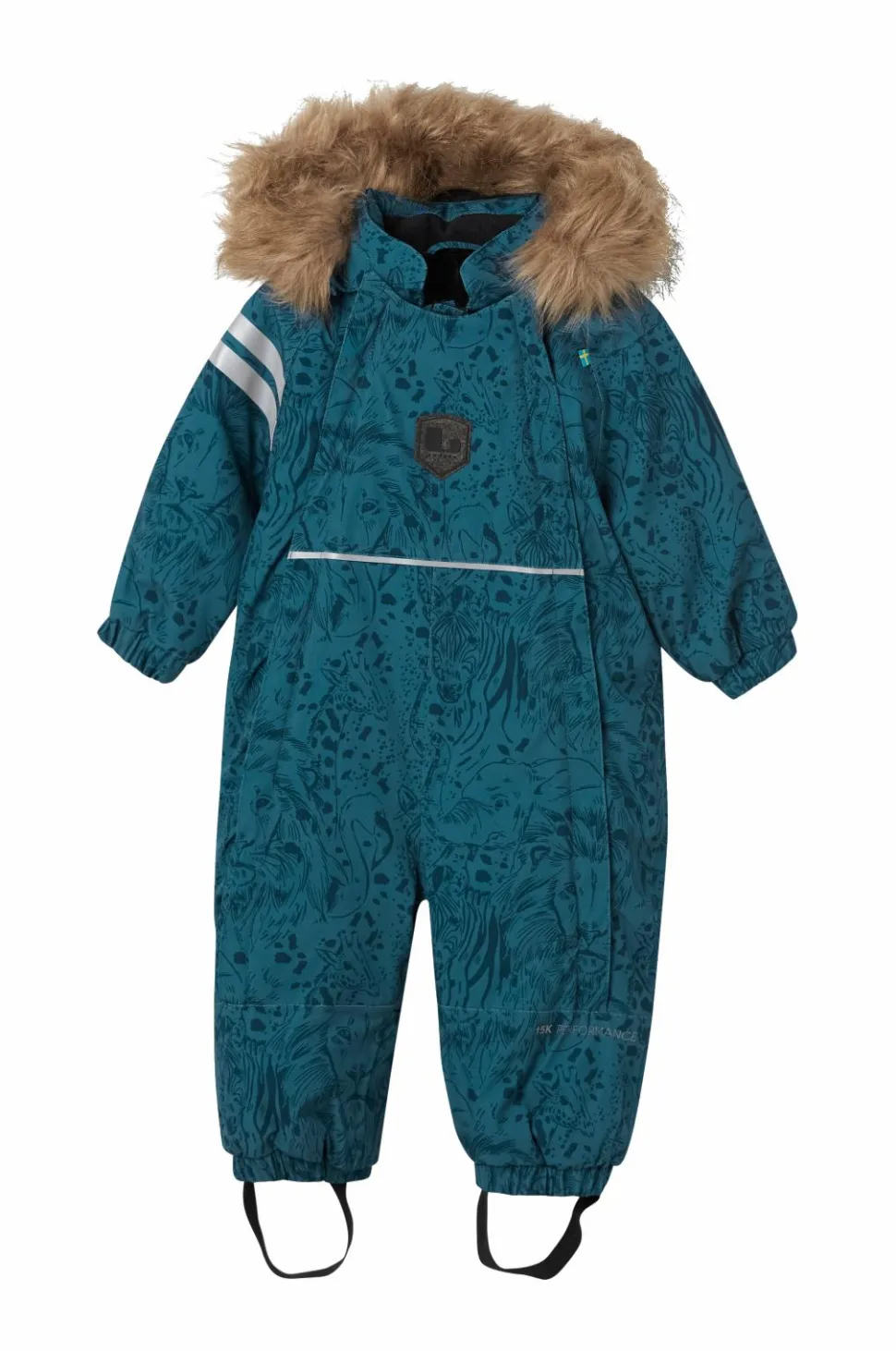 Aftagelig, foret hætte med aftagelig kant af kunstpels. Høj krave med børstet, blød tekstil på indersiden. To lynlåse går ned i det ene ben, hvilket gør dragten nemmere at tage på og af. Kan ombukkes ved hænder og fødder. Elastik i ærmekant og benkant. Elastiske, justerbare fodstropper samt refleksdetaljer.