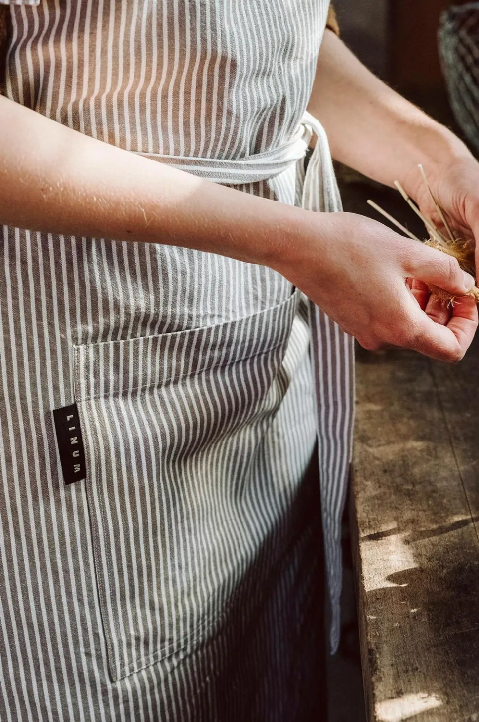 Med sin smalle, sofistikerede stribe, justerbare nakkestrop og praktiske lomme er Emma et nyttigt forklæde året rundt i køkkenet. Modellen har også store stropper og kan derfor bæres af både mænd og kvinder eller bindes foran og bagpå. Emma er fremstillet af 100 % økologisk, slidstærkt bomuld og kan maskinvaskes ved 40 °C.