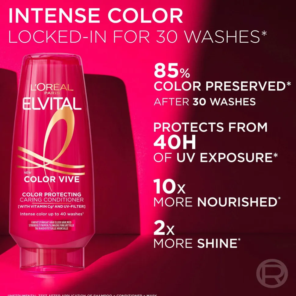 L’Oréal Paris Elvital Color Vive conditioner er en farvebeskyttende og plejende balsam – perfekt til farvet hår eller hår med highlights. Formlen er beriget med vitamin Cg** og UV-filter og forlænger farveintensitetens holdbarhed med op til 40 hårvaske*.