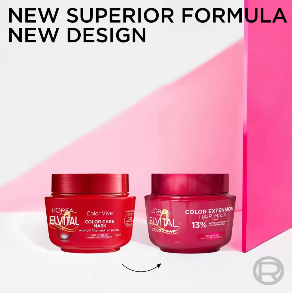 L’Oréal Paris Elvital Color Vive mask er en farvebeskyttende og plejende hårmaske – perfekt til farvet hår eller hår med highlights. Formlen er beriget med vitamin Cg** for at forlænge farveintensitetens holdbarhed med op til 40 hårvaske*.