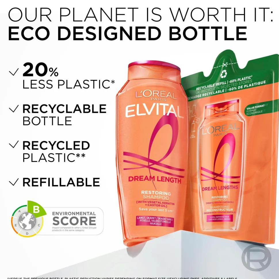 L’Oréal Paris Elvital Dream Length Shampoo er en genopbyggende shampoo til langt og skadet hår. Med en plejende formel som intenst reparerer længderne og er beriget med vegetabilsk keratin, vitaminer og ricinolie. Ikke flere tynde, spaltede spidser – kun langt, glansfuldt hår som føles næret og stærkere*.