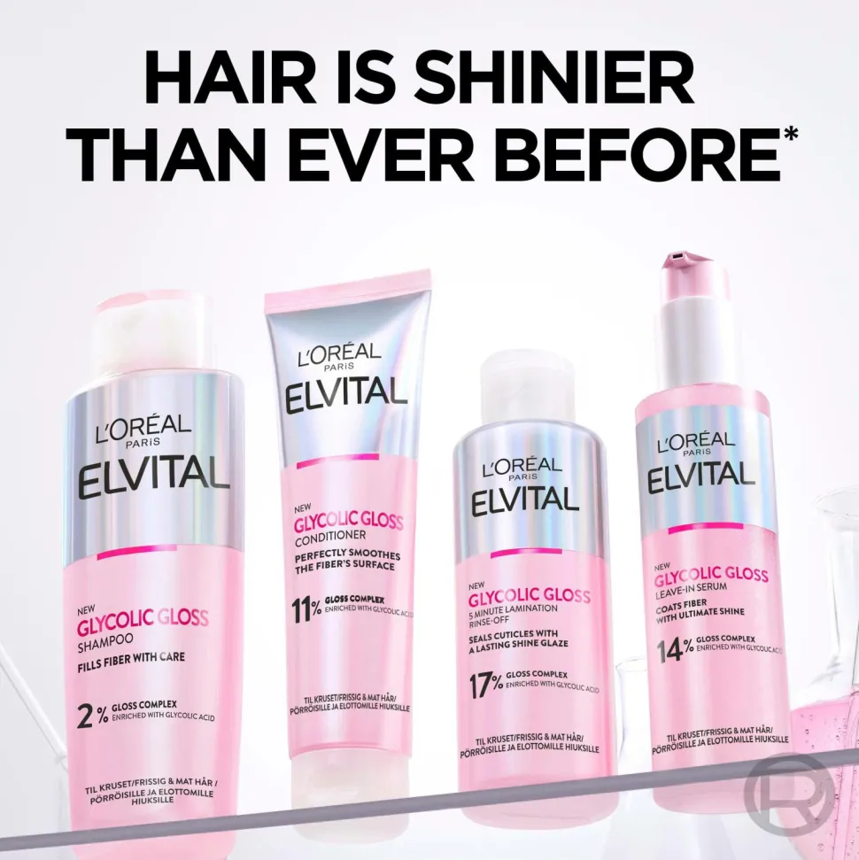 “L’Oréal Paris Elvital Glycolic Gloss Leave-In serum til kruset, mat hår forsegler hårets fibre og giver glans. Serumet forbedrer hårets glans med 82%*, gør det 54% glattere* og 75% mindre kruset*.