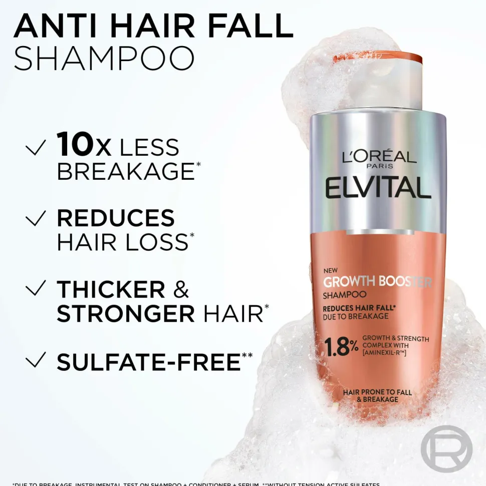 Elvital Growth Booster Shampoo fra L’Oréal Paris er en styrkende shampoo som mindsker hårtab*. Faktorer som stress, arvelighed og ydre påvirkning kan lede til at du taber hår fordi hårstråene lettere knækker. Denne shampoo er beriget med Growth and Strength Complex Aminexil-RTM, og det er kosmetoklinisk dokumenteret at formlen styrker hårfibrene, bidrager til at 10X færre hårstrå knækker og dermed forlænger hårets livscyklus.