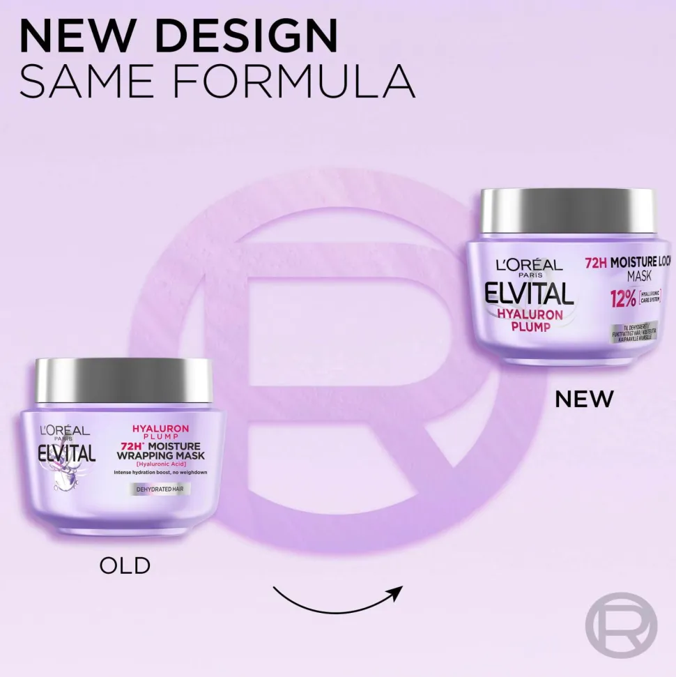 L’Oréal Paris Elvital Hyaluron Plump 72H* Moisture Wrapping Mask for dehydreret hår er beriget med hyaluronsyre. Dette molekyle som findes naturligt i kroppen, absorberer 1000 gange sin egen vægt i vand og hjælper med at give fyldigt hår.