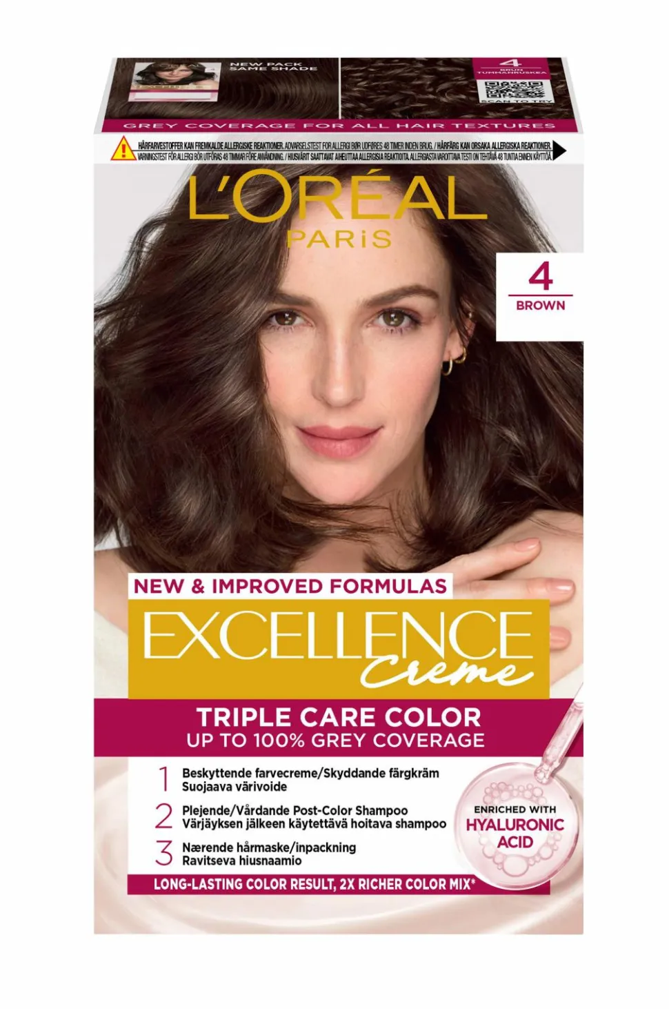 L’Oreal Paris Excellence Crème er en fantastisk permanent hårfarve, hvis du vil dække grå hår og samtidig beskytte og styrke dit hår. Excellence Crème-serien tilbyder klassiske og elegante farver, der giver fyldige, langtidsholdbare farveresultater. Triple Care Color-ritualet er beriget med hyaluronsyre og er et tretrinsprogram, der styrker og beskytter dit hår, samtidig med at det sikrer 10 gange mere fugt** og 2 gange rigere farveblanding* for en drypfri påføring. Op til 100 % dækning af gråt hår og velegnet til alle hårstrukturer.