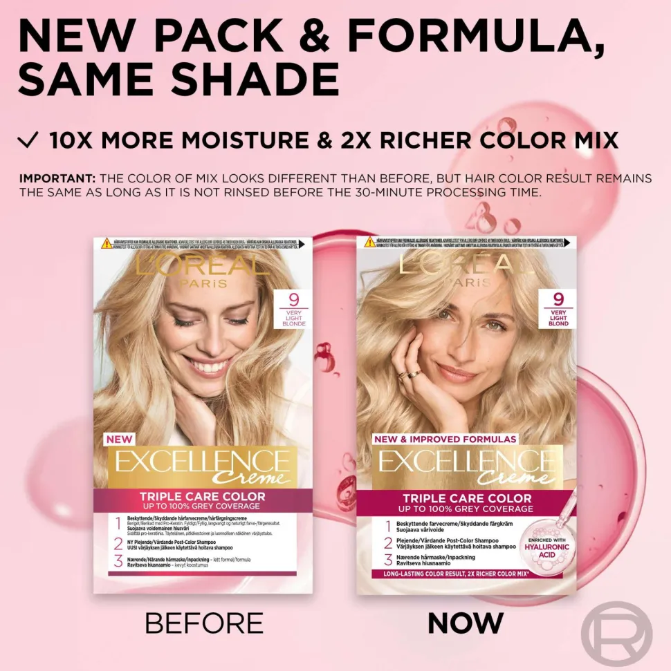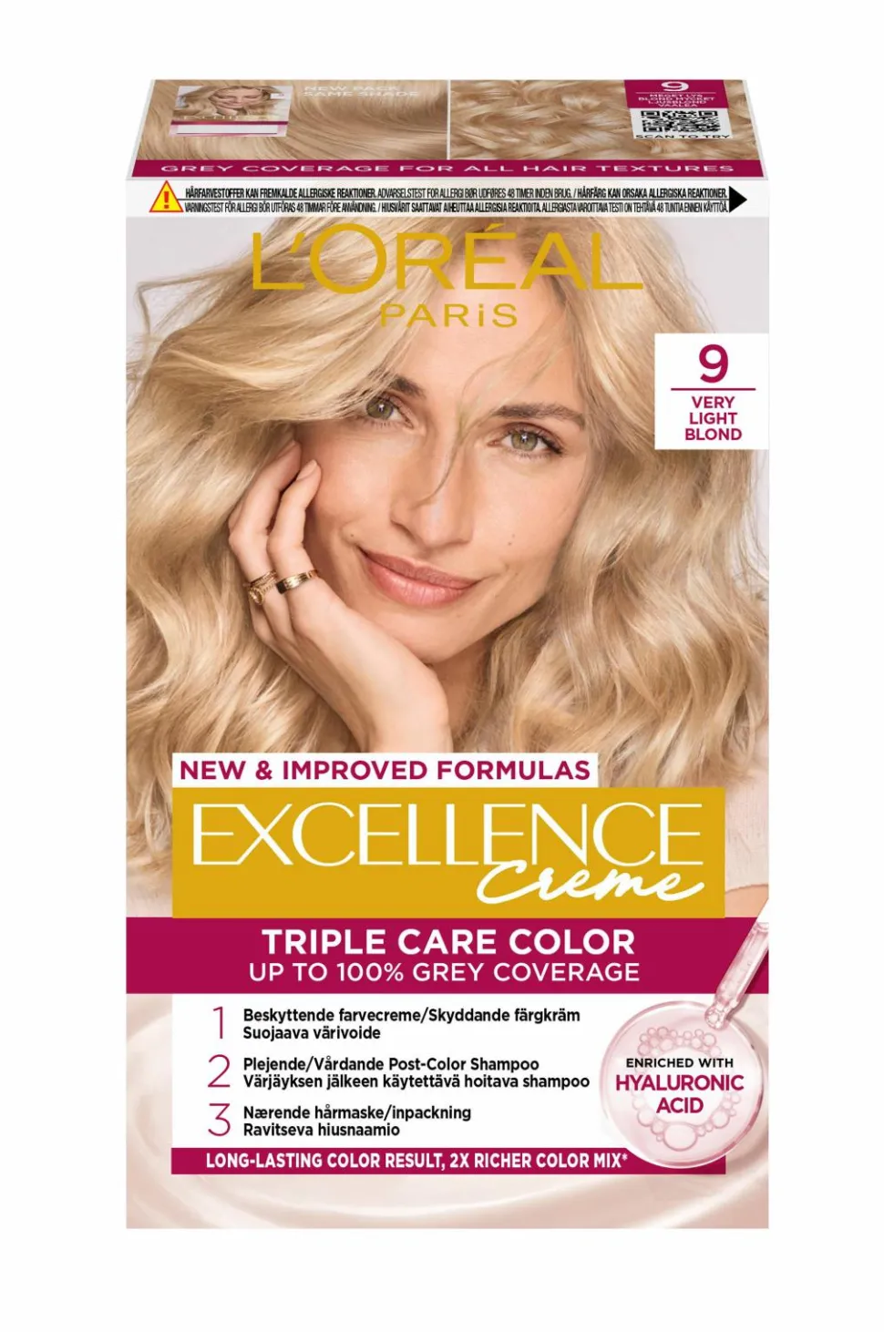 L’Oreal Paris Excellence Crème er en fantastisk permanent hårfarve, hvis du vil dække grå hår og samtidig beskytte og styrke dit hår. Excellence Crème-serien tilbyder klassiske og elegante farver, der giver fyldige, langtidsholdbare farveresultater. Triple Care Color-ritualet er beriget med hyaluronsyre og er et tretrinsprogram, der styrker og beskytter dit hår, samtidig med at det sikrer 10 gange mere fugt** og 2 gange rigere farveblanding* for en drypfri påføring. Op til 100 % dækning af gråt hår og velegnet til alle hårstrukturer.