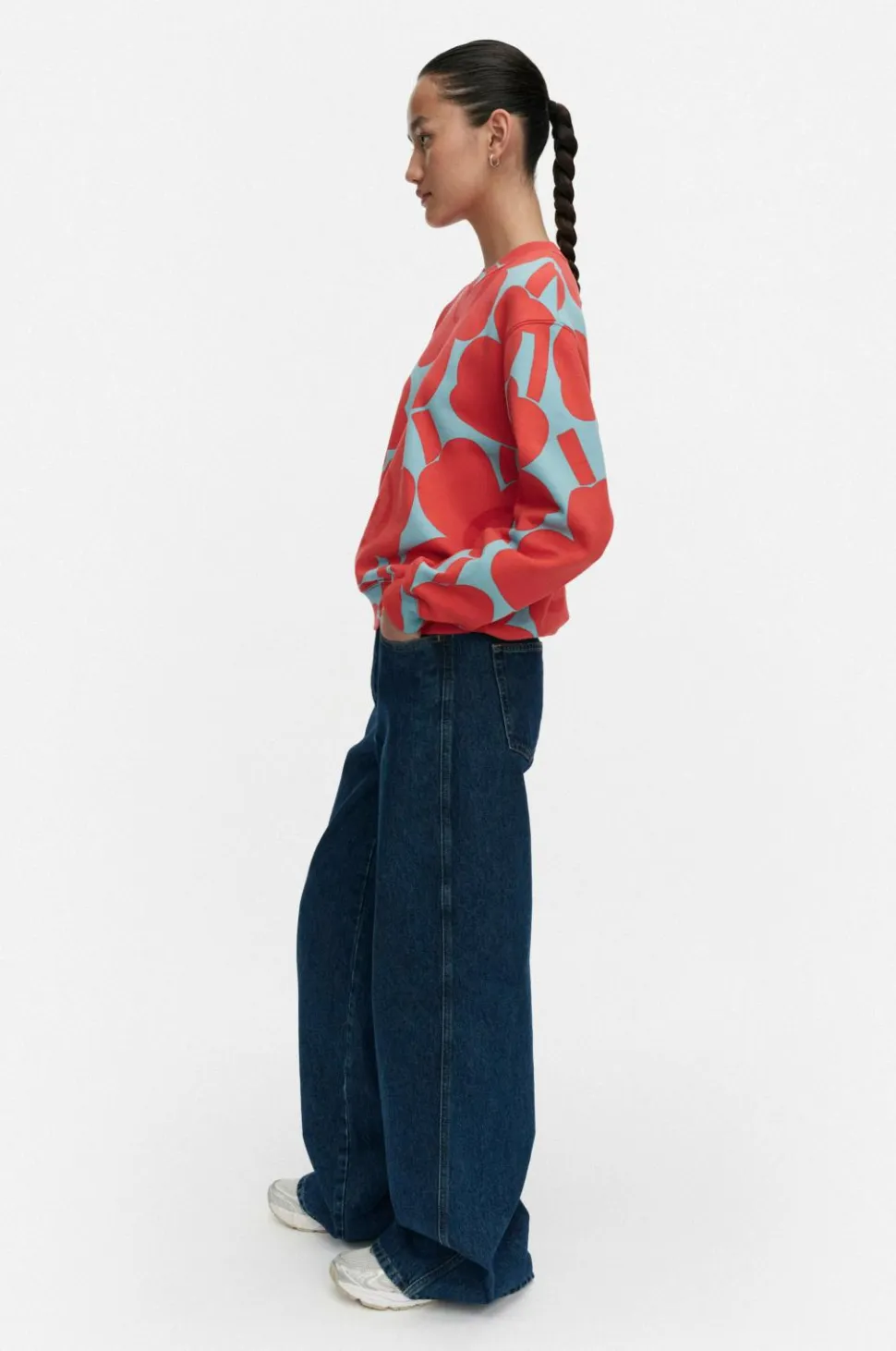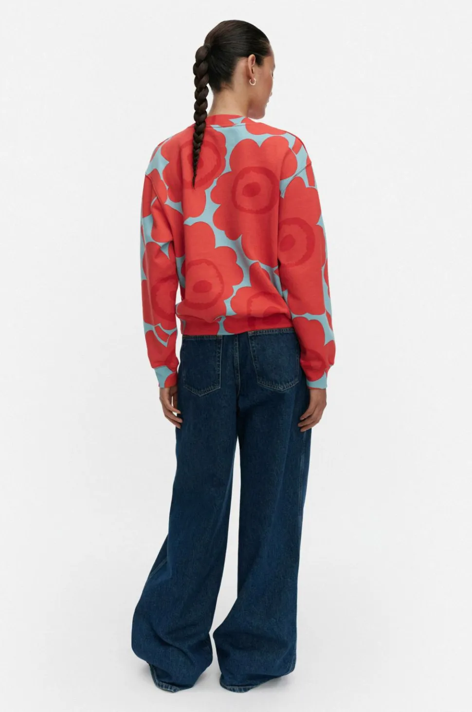 Sweatshirten Leiot er lavet af fransk bomuldsfrotté og har en afslappet pasform. Sweatshirten har mønsteret Unikko. Sweatshirten har en ribbet O-hals og brede ribkanter ved ærmeafslutningerne og forneden.