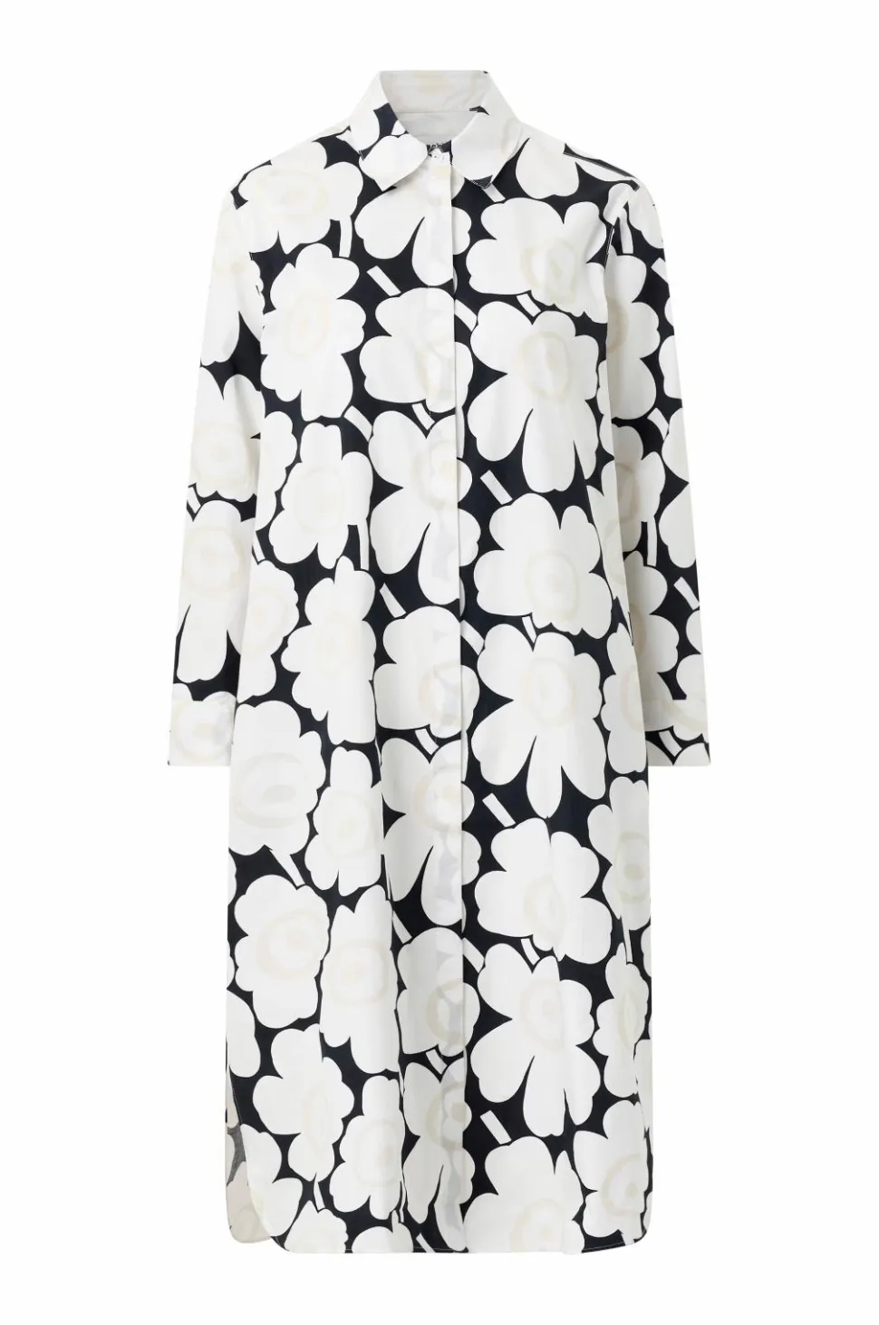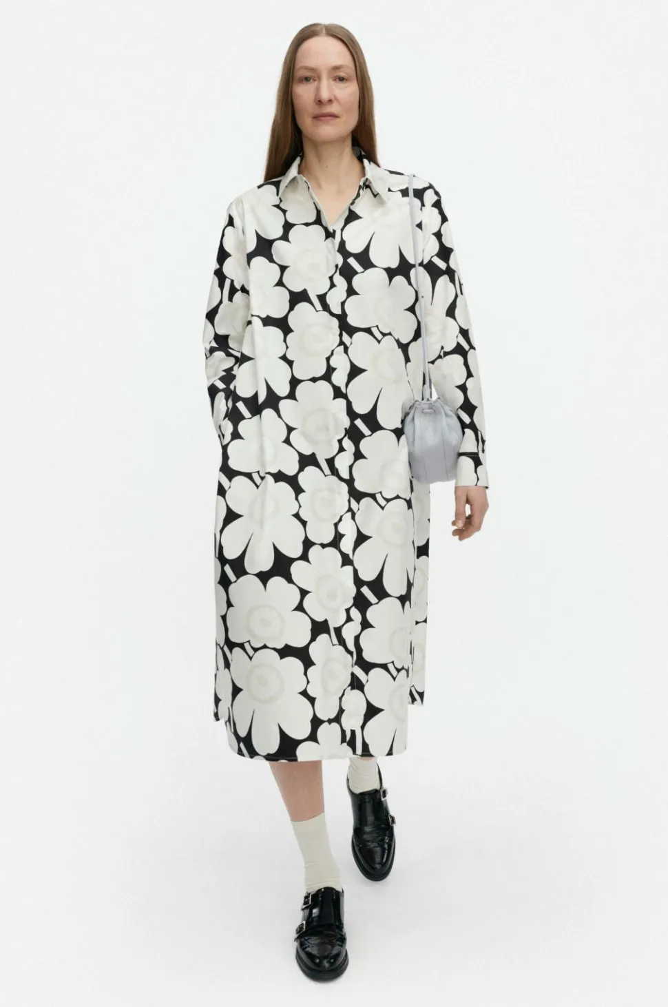 Skjortekjolen i bomuldspoplin fra Runoelma har en afslappet, A-formet pasform og er trykt i Unikko -mønsteret. Kjolen har en spids krave, skjult knaplukning, sidesømslommer og en buet kant forneden. De opsmøgede ærmer har knaplukning.