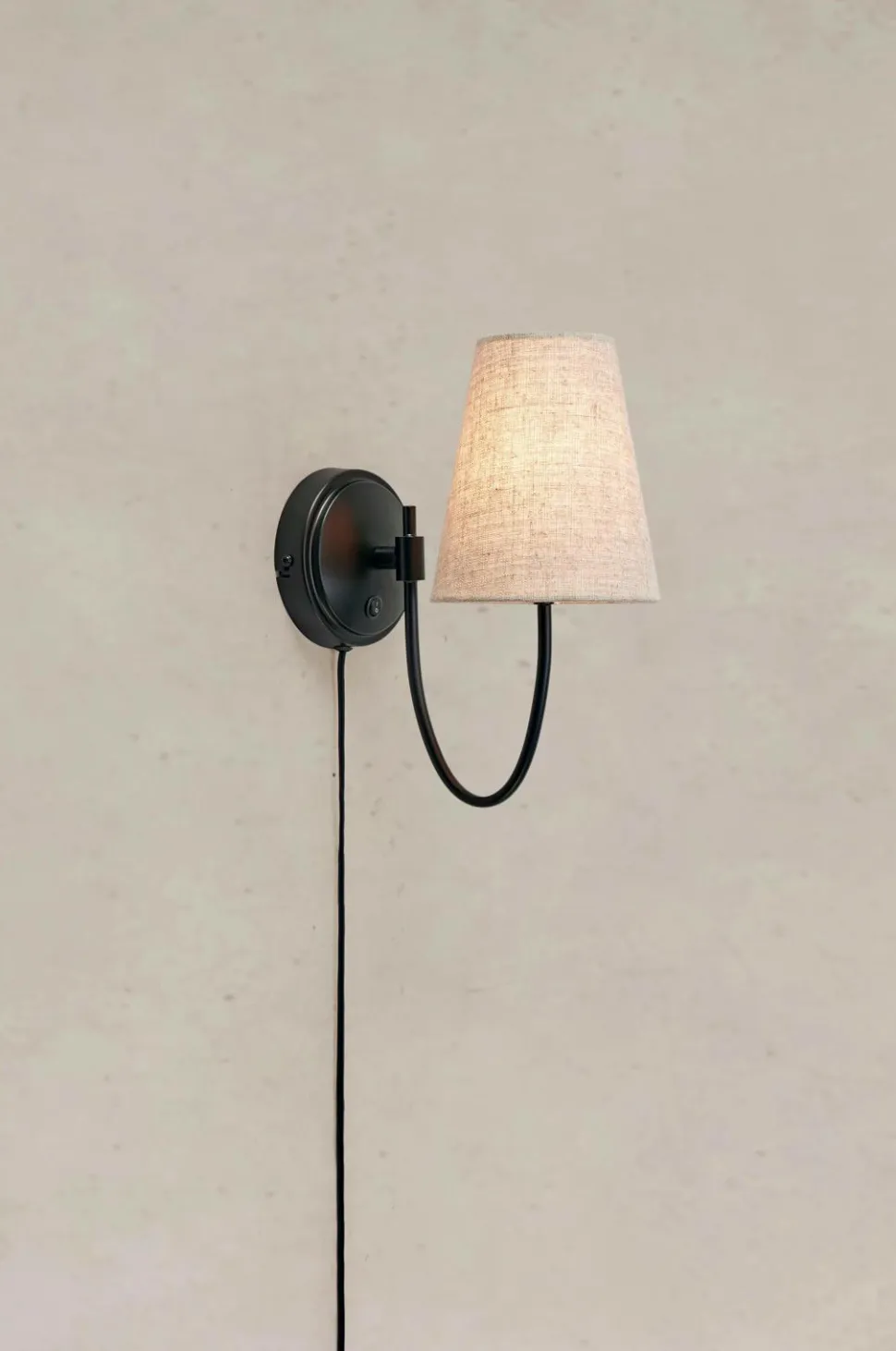 Amar væglampe fra markslöjd. Base i metal med hørskærm. 2 m pvc-kabel og vægstik. Indbygget afbryder på vægpladen. Tilslutningsboks inde i vægpladen for nem fjernelse af kabel og ændring til fast installation. Monteret med vægbeslag. 1xe14, maks. 40w. Klasse ii. Lyskilde medfølger ikke.