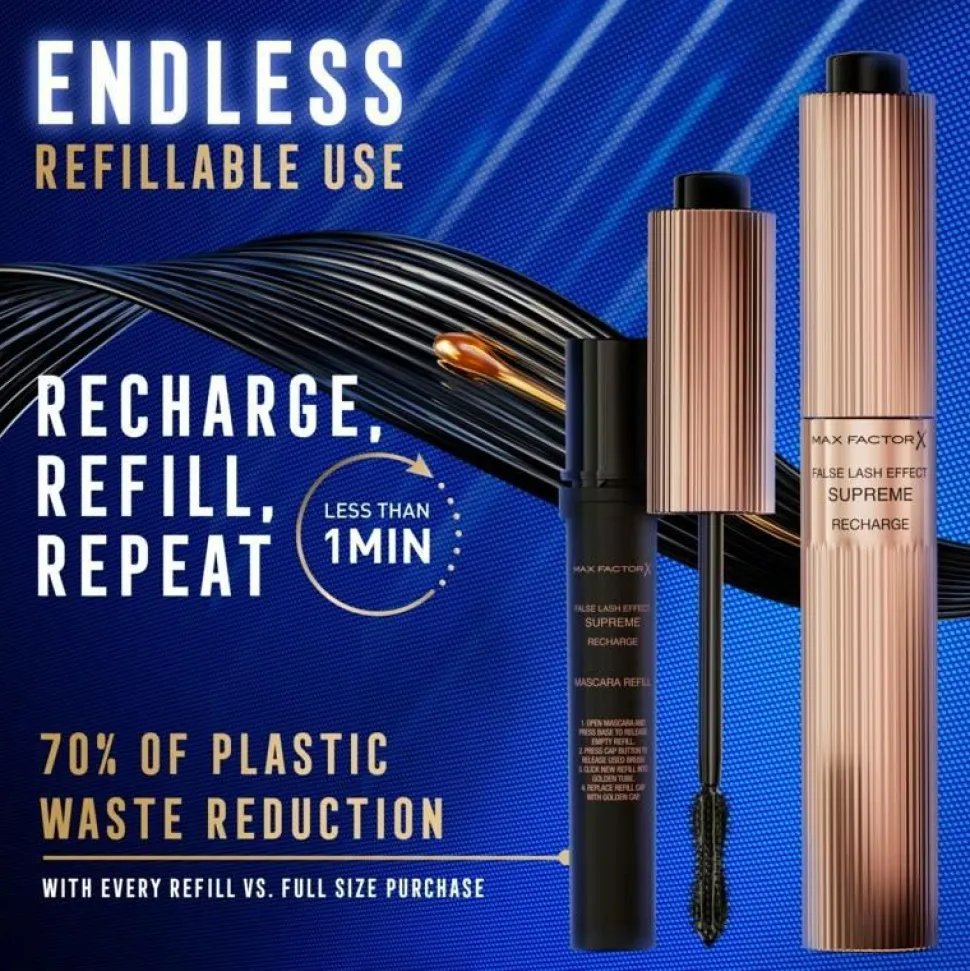 Mød vores hidtil mest suveræne vippeløsning og den første genopfyldelige mascara, Max Factor False Lash Effect Supreme Recharge. Opbyg øjeblikkeligt 7x volumen* med den ekstra fordel, at vipperne ser sundere ud på 4 uger**. Supreme Recharge Mascara har en vippeskulpterende børste med unikke børster, der dækker hver vippe for fuld effekt og stor volumen, kombineret med en keratinrig formel. Fås i et højteknologisk, genopfyldeligt design til endeløs brug. Genoplad, genopfyld, gentag!
