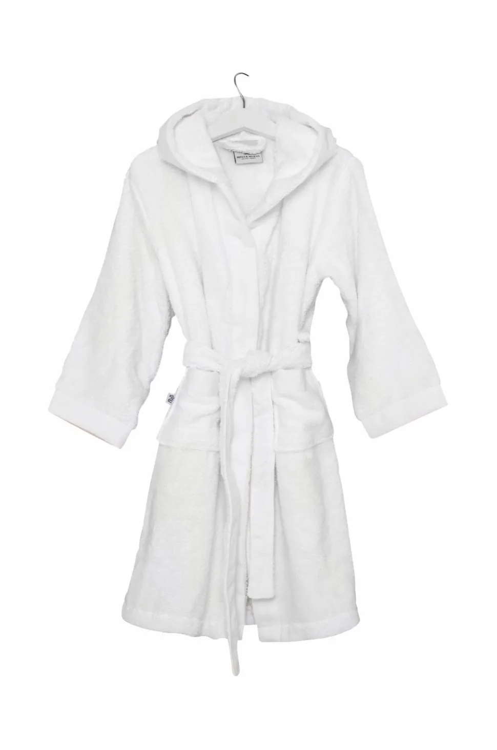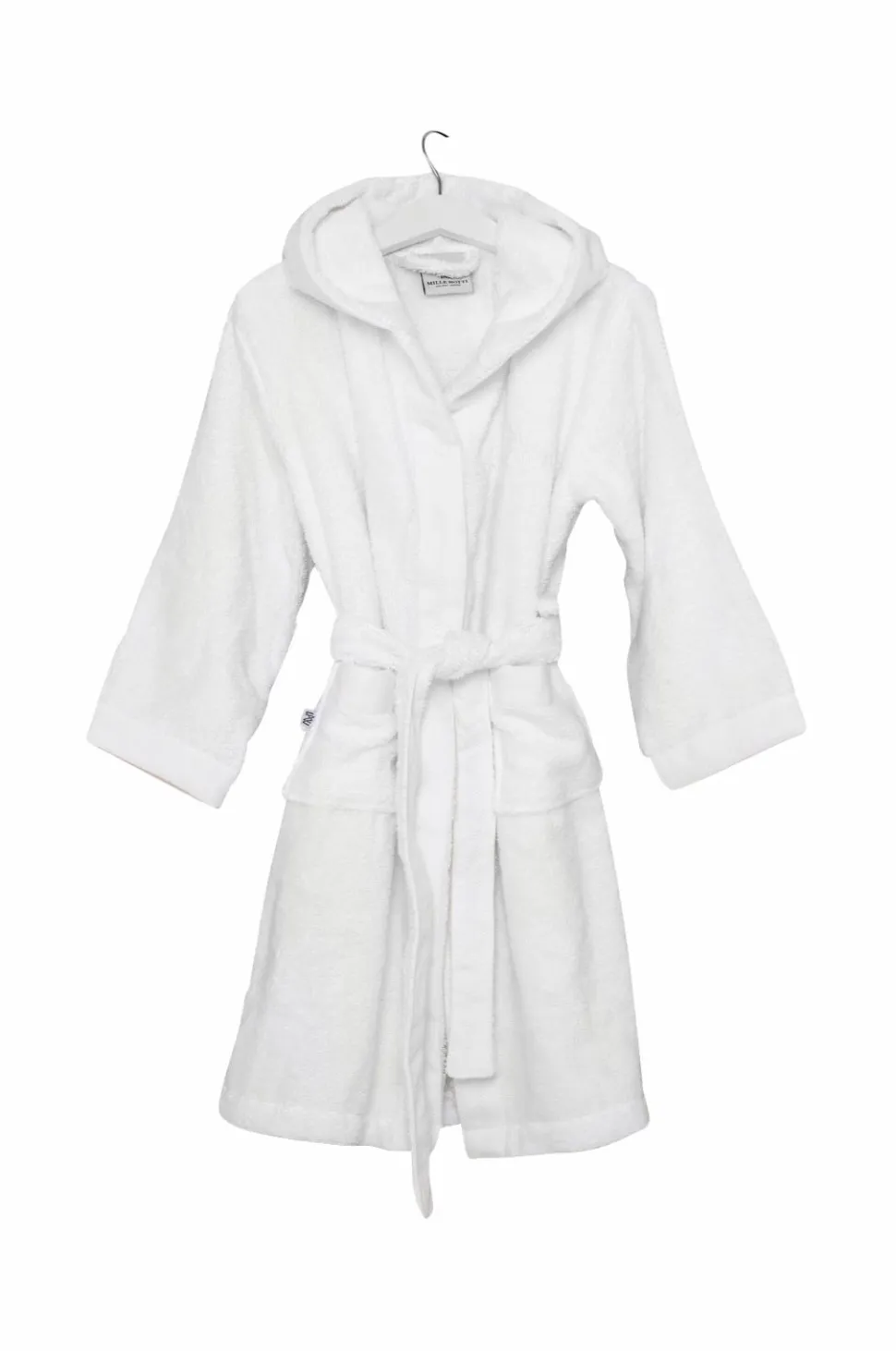 Blød og hyggelig badekåbe til børn i kæmmet bomuldsfrotté med en vægt på 360 g/m². Meget absorberende og hurtigtørrende. Lavet med hætte, to lommer foran, knapper og et bælte, der kan bindes. Mille Notti-logoet er broderet på brystet.