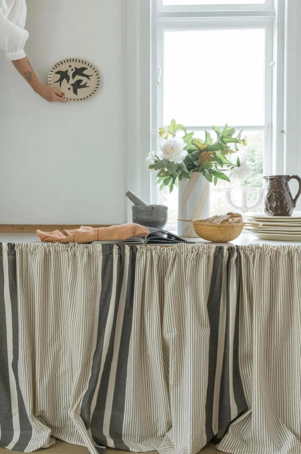Ekstra bredt Bistro-gardin i håndvævet, stribet bomuldsstof. Gardinet er skræddersyet med en lomme, der passer til en lille gardinstang, og har en lille rynke i toppen. Gardinet er lavet af 3 stykker håndvævet stof, der er sat sammen, har rå kanter og en dobbelt fold i bunden. Kanten forneden har også en åbning i hver side, så gardinet kan bruges som spændegardin i vinduer, på døre eller skabe. Stoffet er håndvævet og vil have uregelmæssigheder i både tykkelse, tråde og farve. 30 graders skånsom maskinvask eller kemisk rensning. Sælges enkeltvis. Bredde: 265 cm. Højde: 85 cm. Materiale: 100% håndvævet bomuld